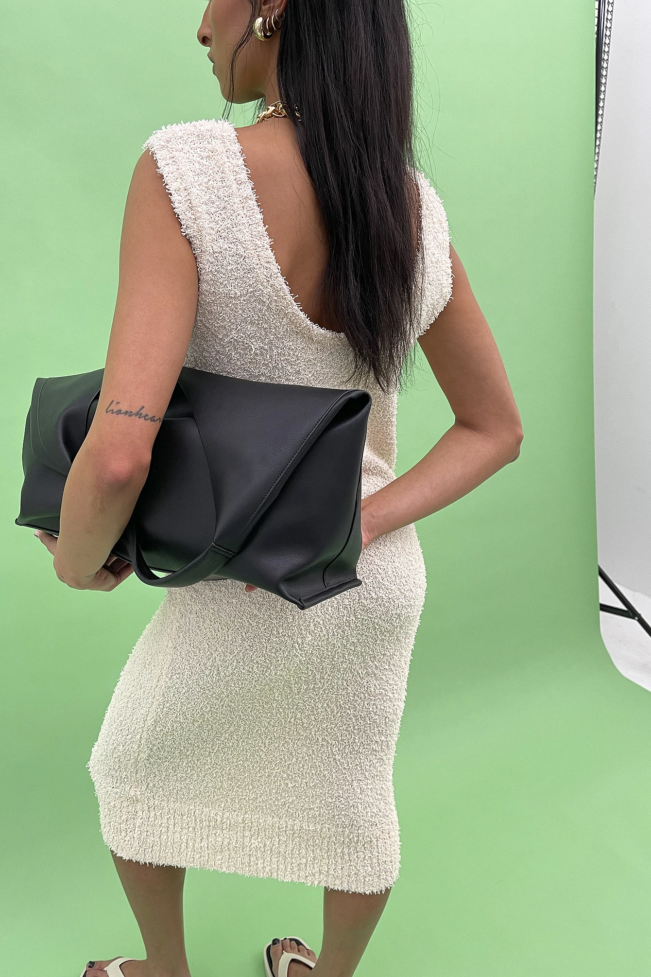 This dress features a rounded neckline. It has wide shoulder straps and a midi length. This dress features a soft, cozy material.