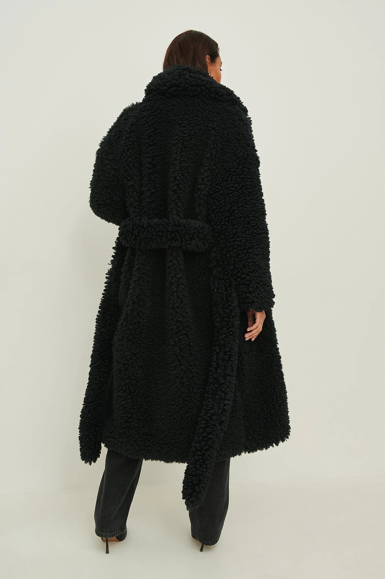 This coat features a double-breasted button closure, long sleeves, belt loops, a self-tie belt at the waist, oversize fit, a long length, underlining, an extra, fluffy material in faux fur and side slanting pockets. Feeling chilly? With this coat you won’t.