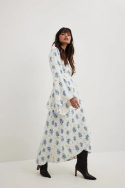 This maxi dress features a v-neck frill neckline. It has long sleeves and a drawstring detail at the cuffs. This maxi dress features a self-tie drawstring around the waist, a ruched detail on the bottom and an asymmetrical design on the bottom front.
