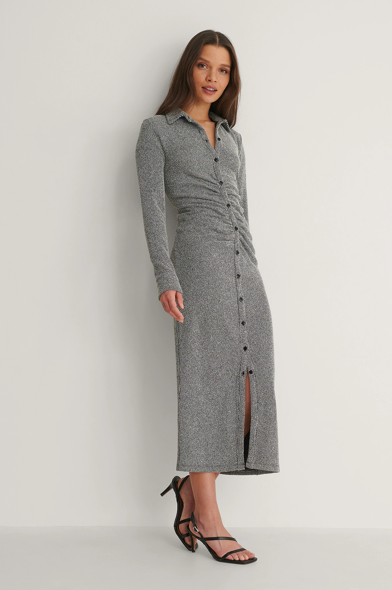 This dress features a classic collar, button closures, long sleeves and a midi length.