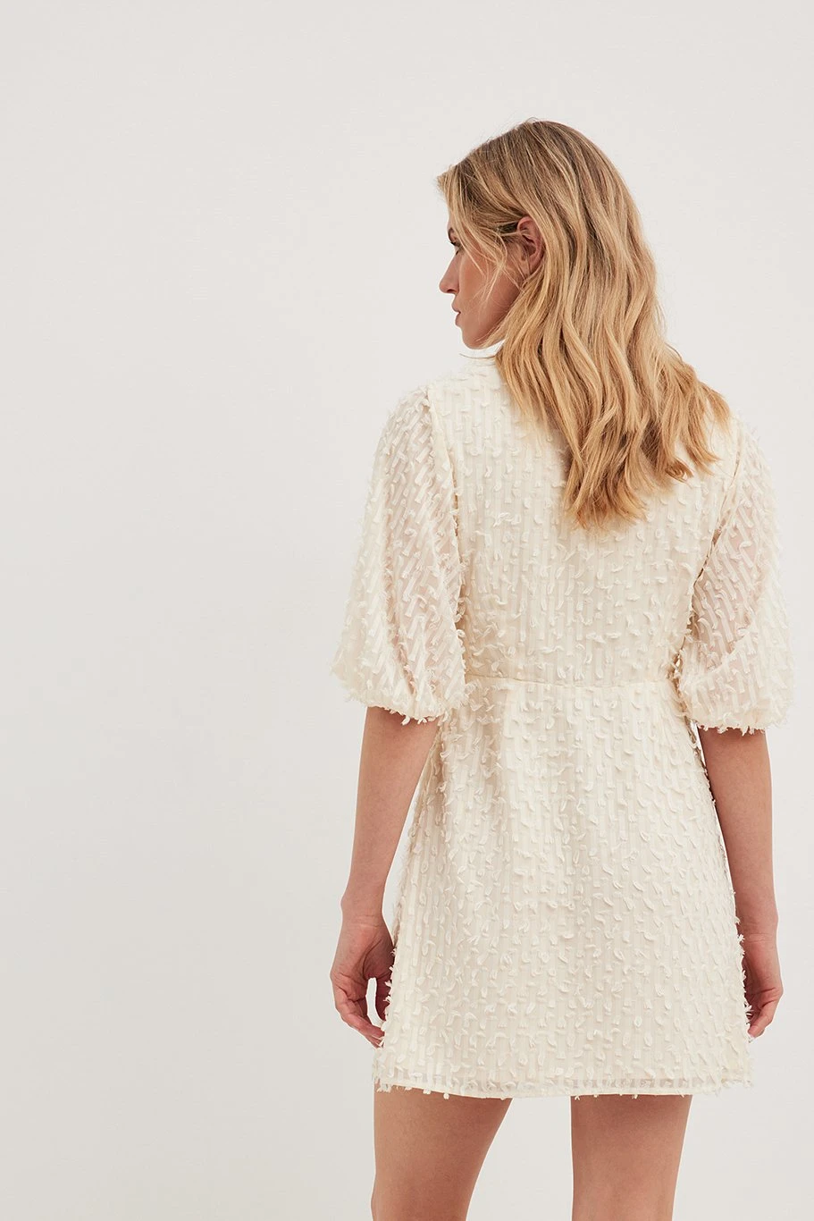 This mini dress features a textured material. It has a flowy fit and a v neckline. This mini dress features puffy short sleeves with elasticized cuffs, a hidden side zipper closure and a lining.