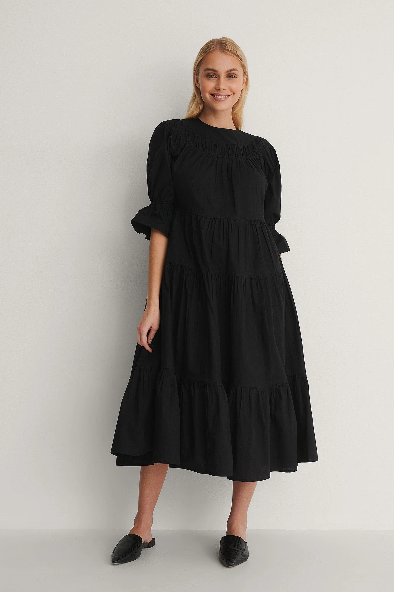 This midi dress features a rounded neckline, short sleeves with elasticized, flounced cuffs, a keyhole closure at the back, gathered details and a flowy fit.