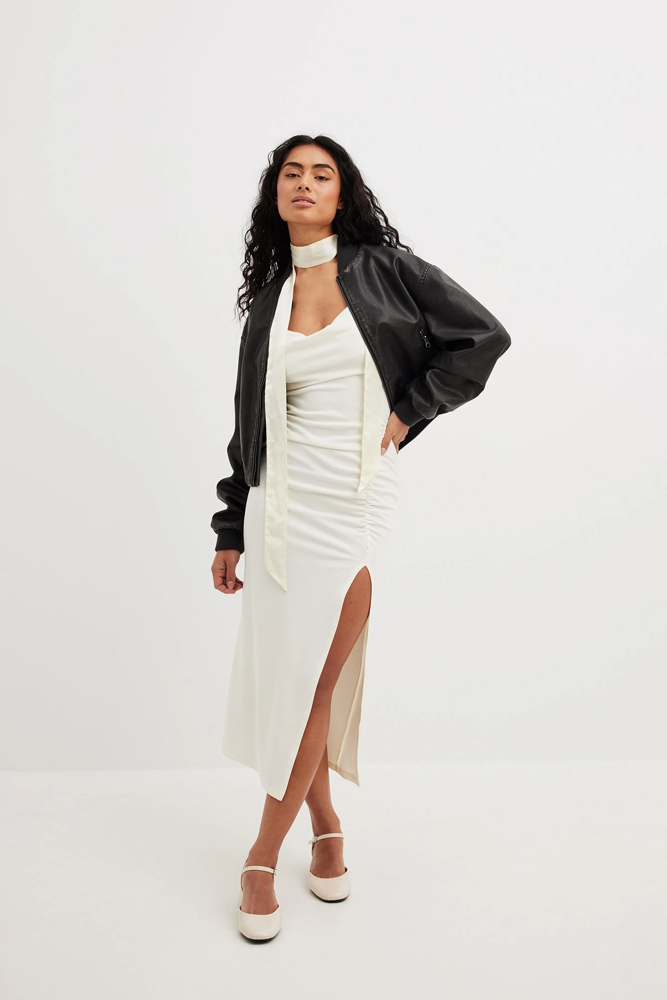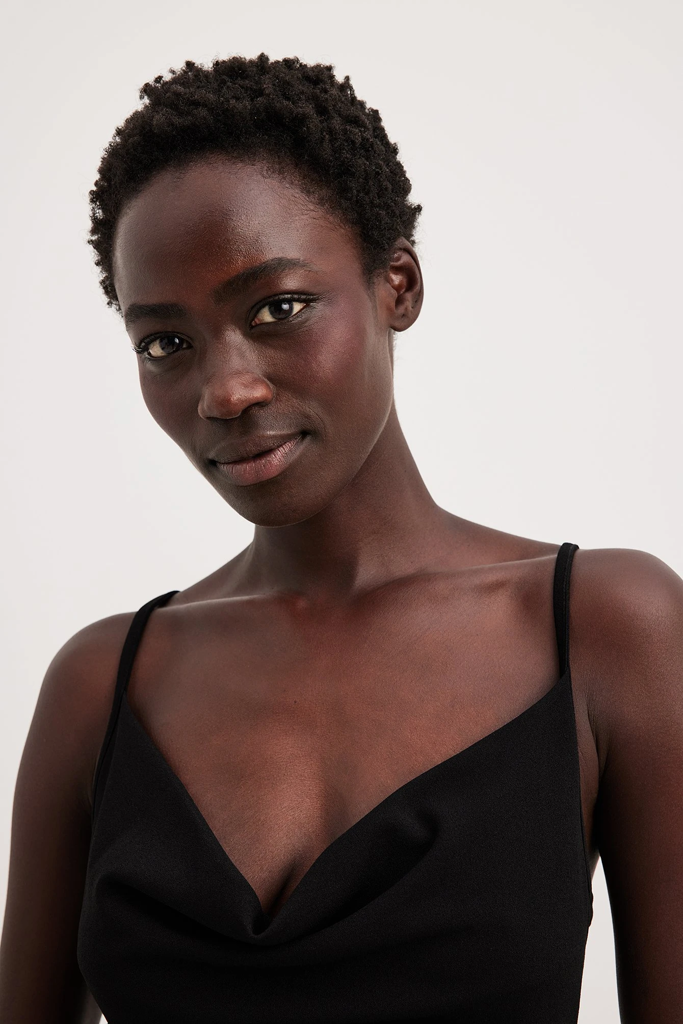 This dress is fitted and features a stretchy material. It has a draped neckline and thin straps. Our dress features gathering on the side and a high side slit.