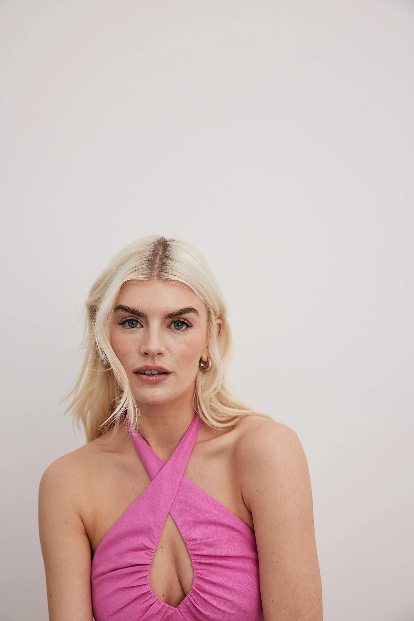 This midi dress features a halterneck design with a self tie detail. It has a slanted asymmetrical design and a side zipper closure. This midi dress features a smocked back.