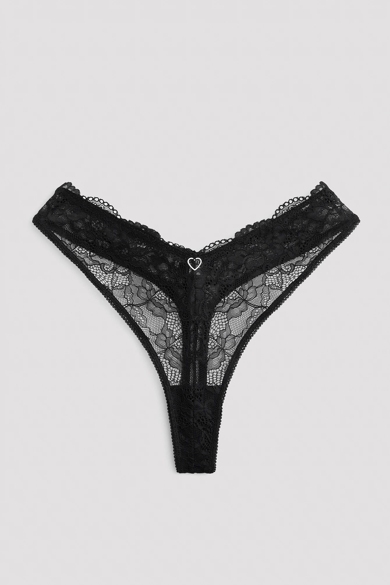 This pantie is made of lace and features a thong design. It has a heart pendant and a crotch lining.