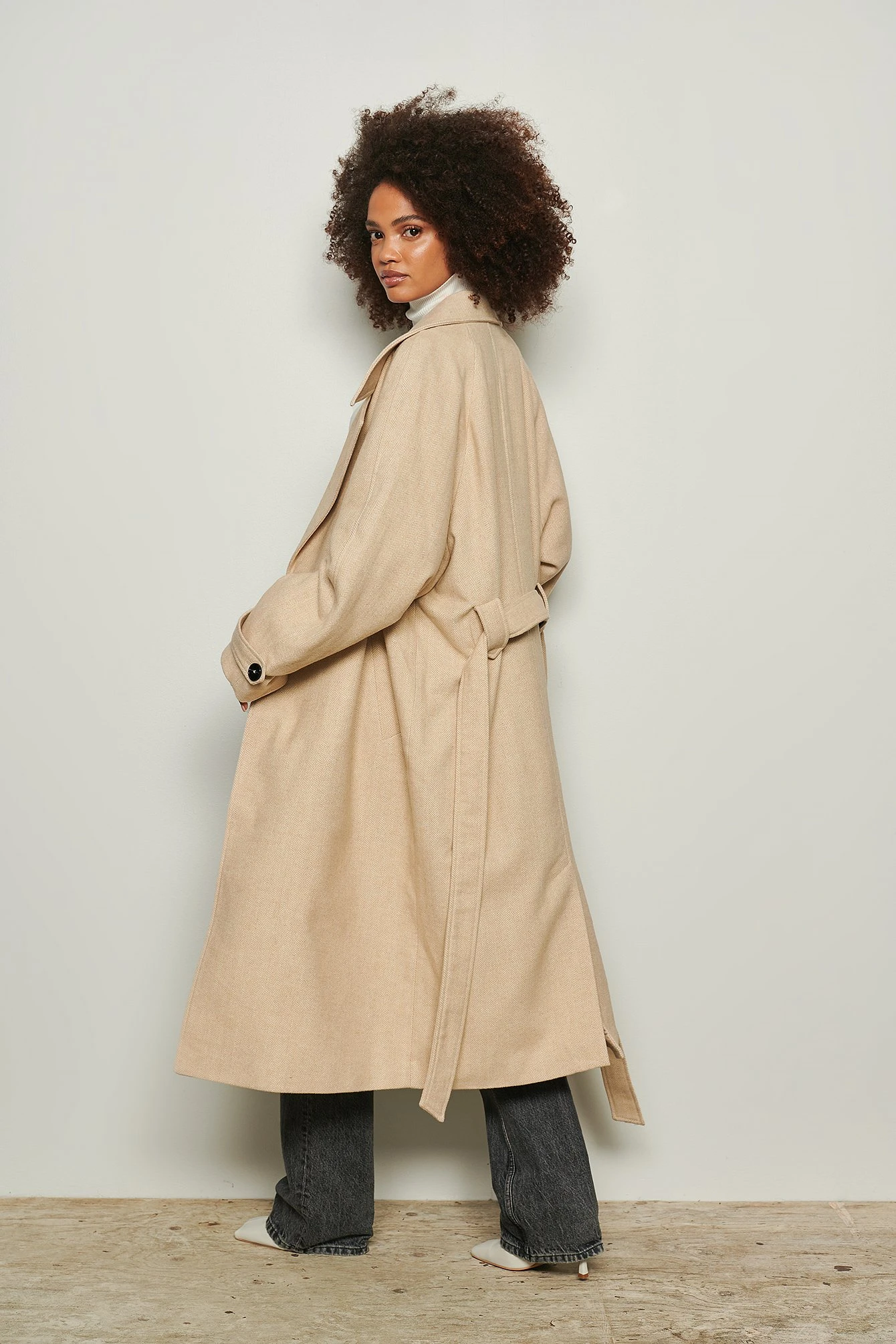 This coat features a lapel neckline. It has long sleeves with button cuffs and a snap button closure. This coat features belt loops on the back with a removable self-tie band, two mock side pockets, a back slit detail, a design with a herringbone pattern and a long, oversized fit.