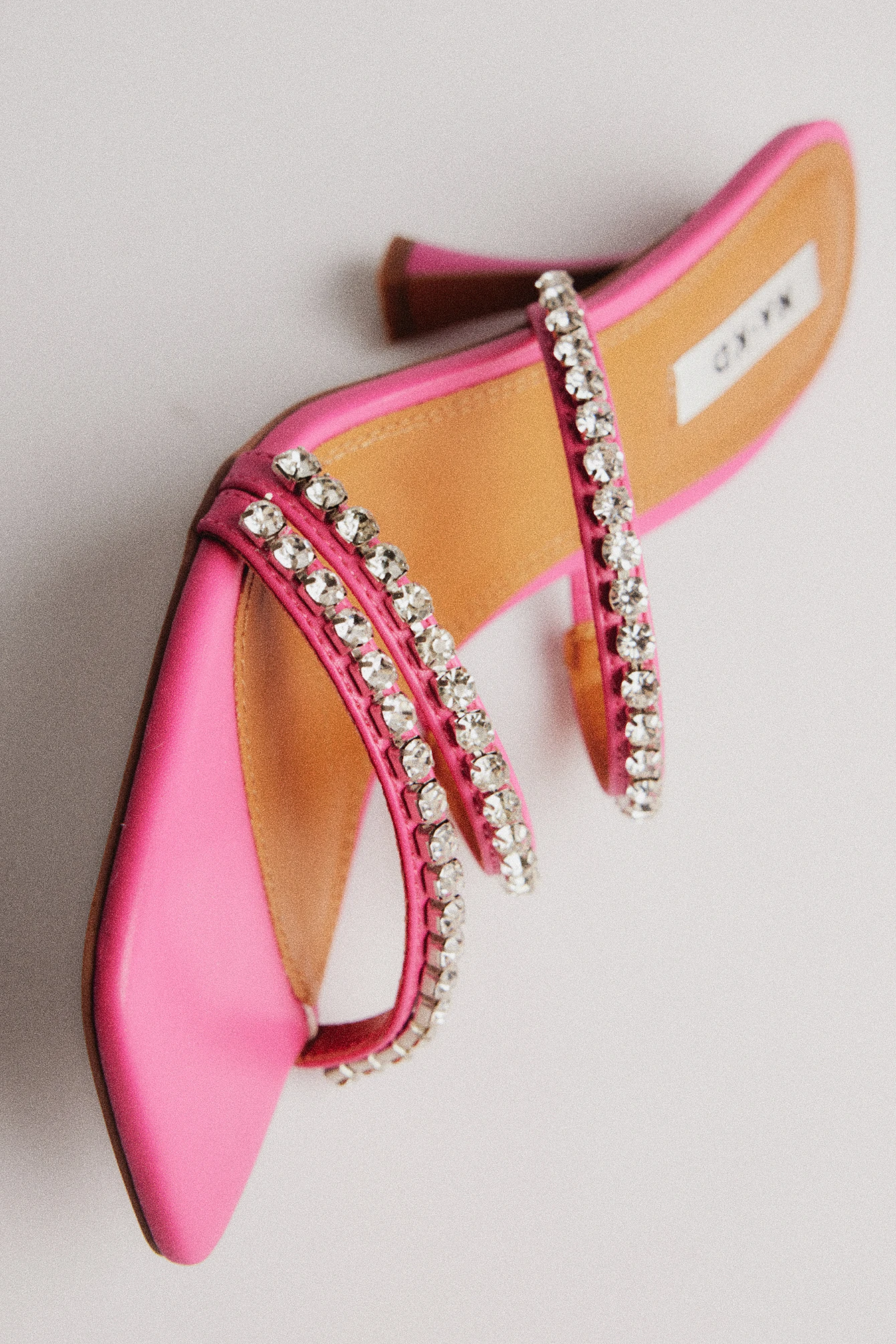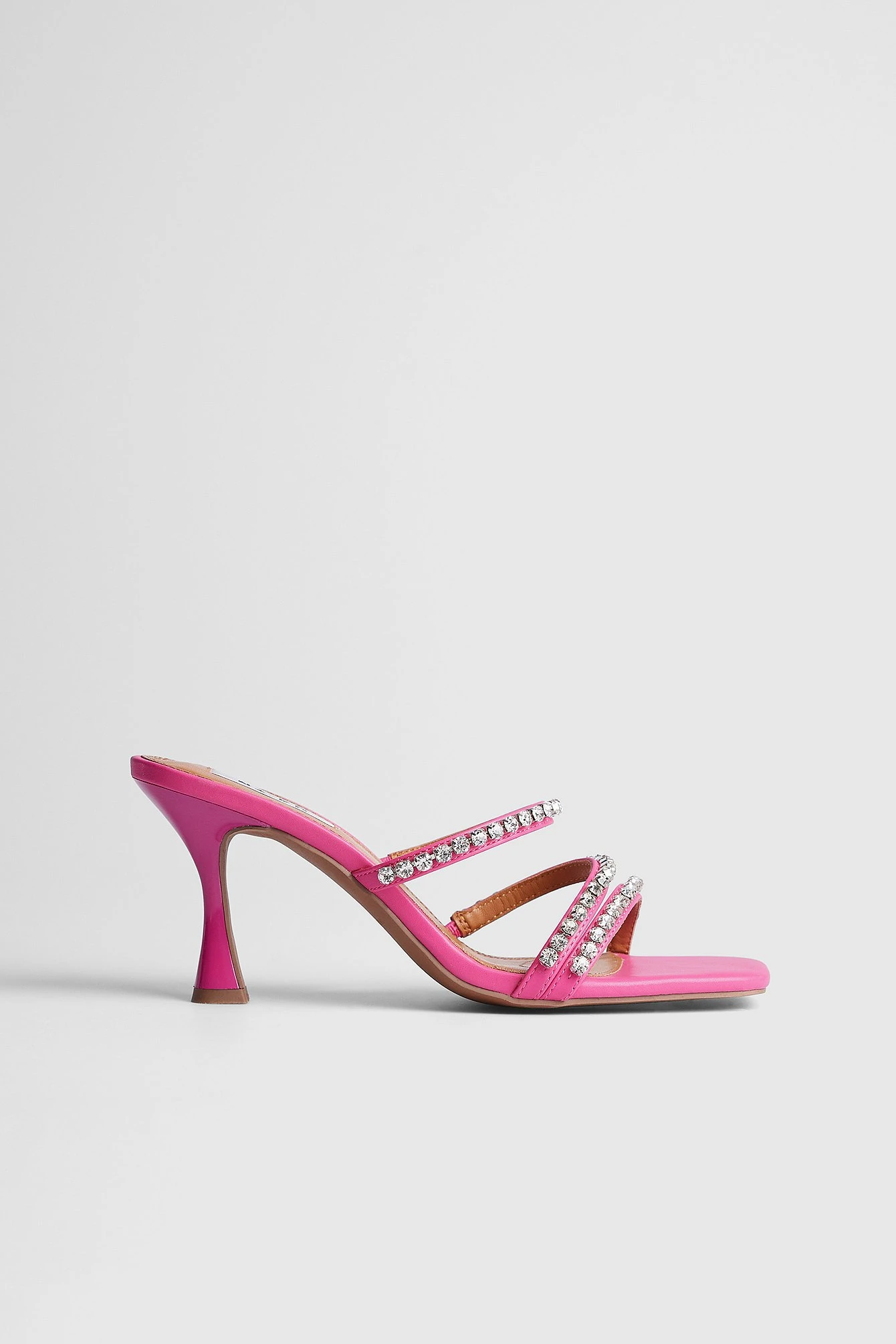 This heel features straps with a rhinestone embellishment. It has a square toe and a thin heel. Measurements in size 39: Heel height: 7 cm / 2.5 in.