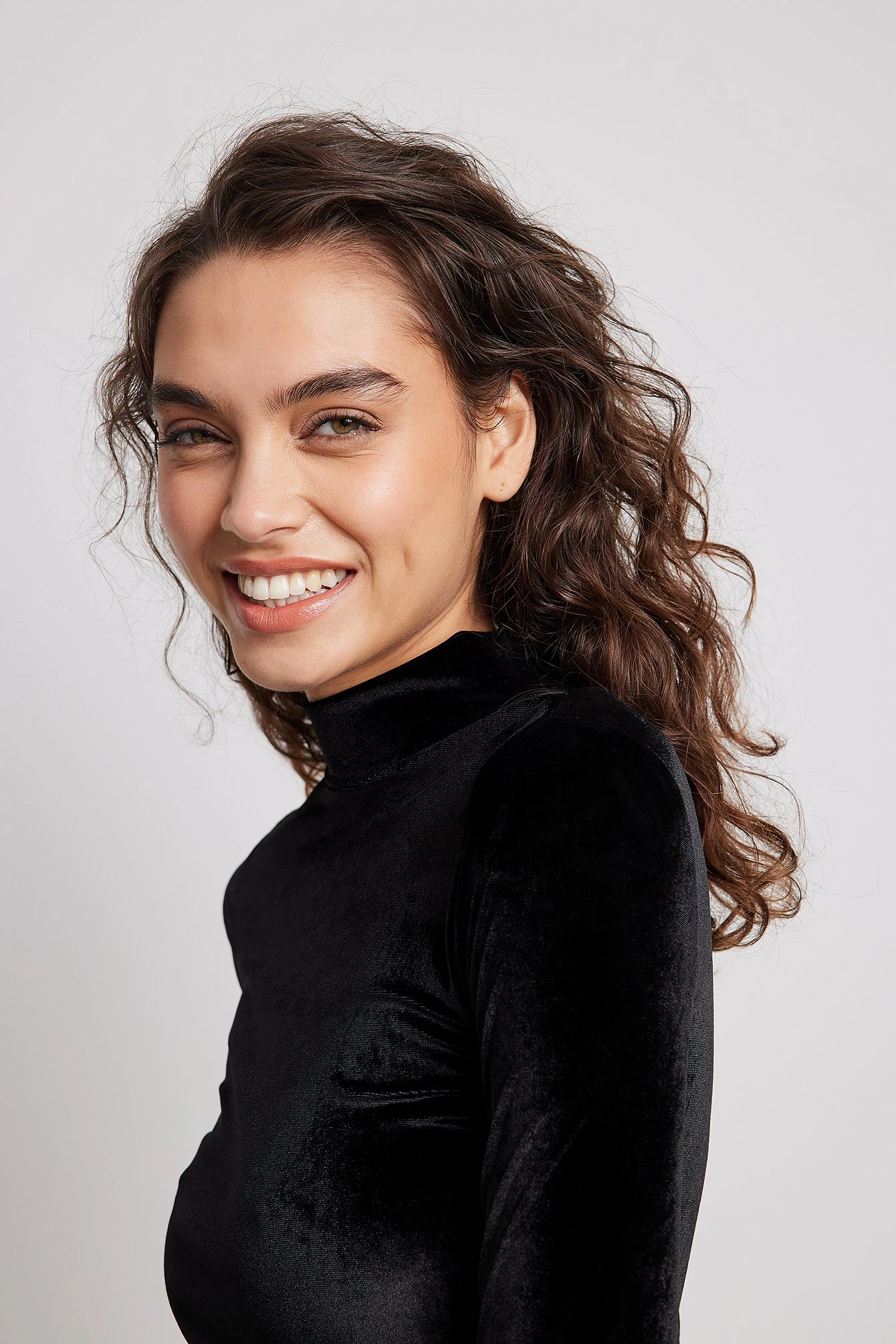 This mini dress is stretchy and made of velvet and features a high neck, long sleeves and a button closure at the back of the neck.