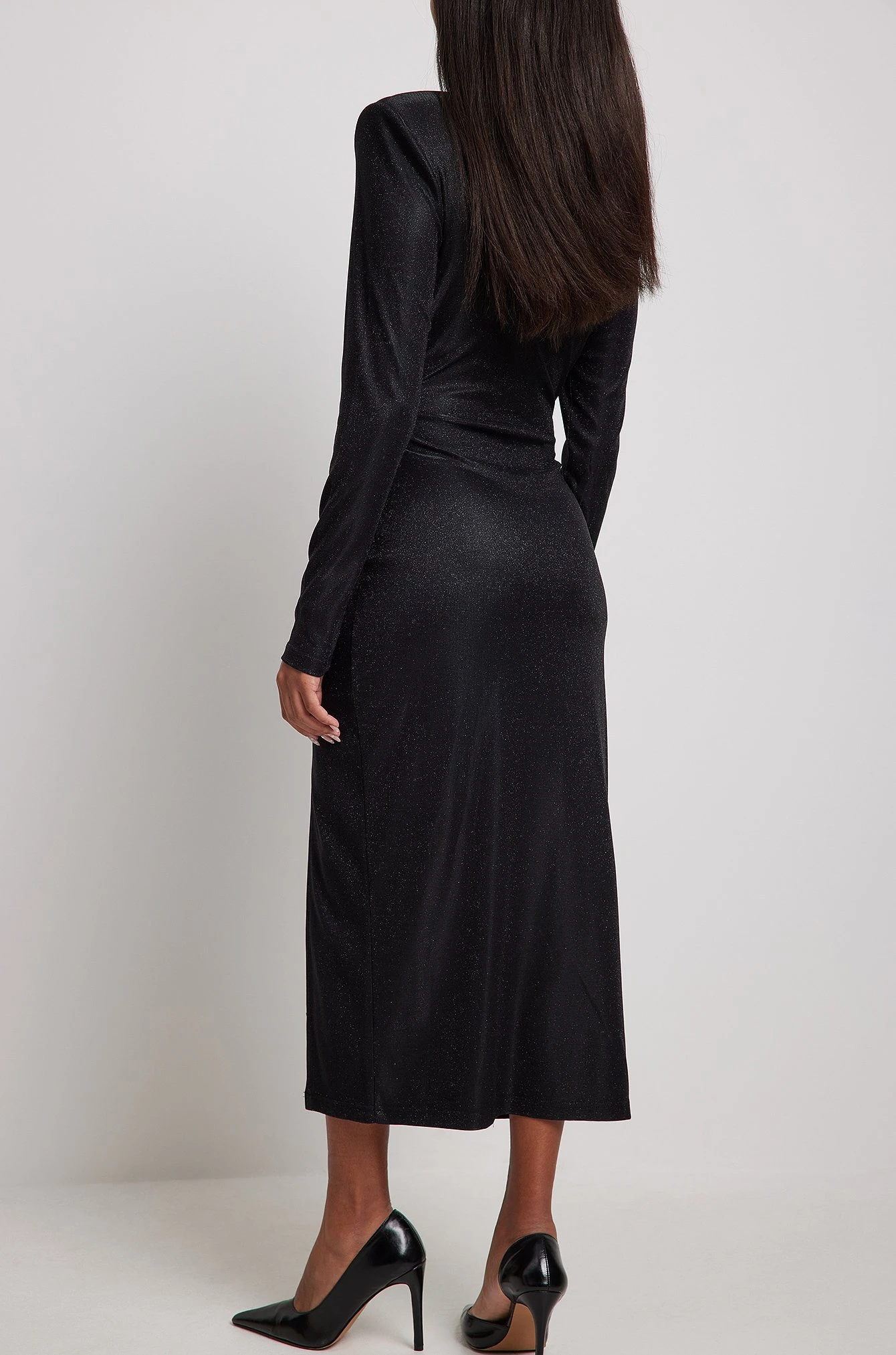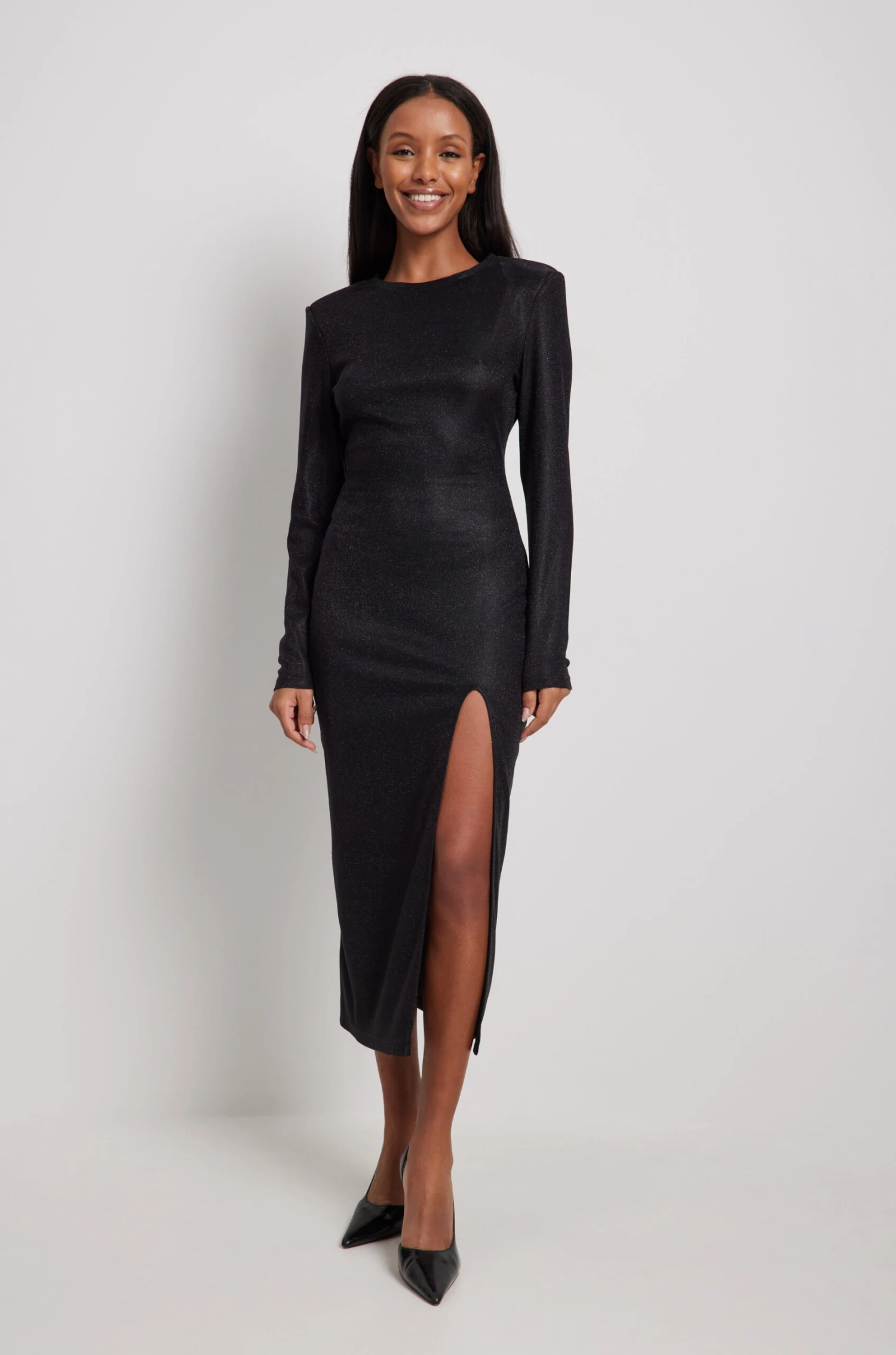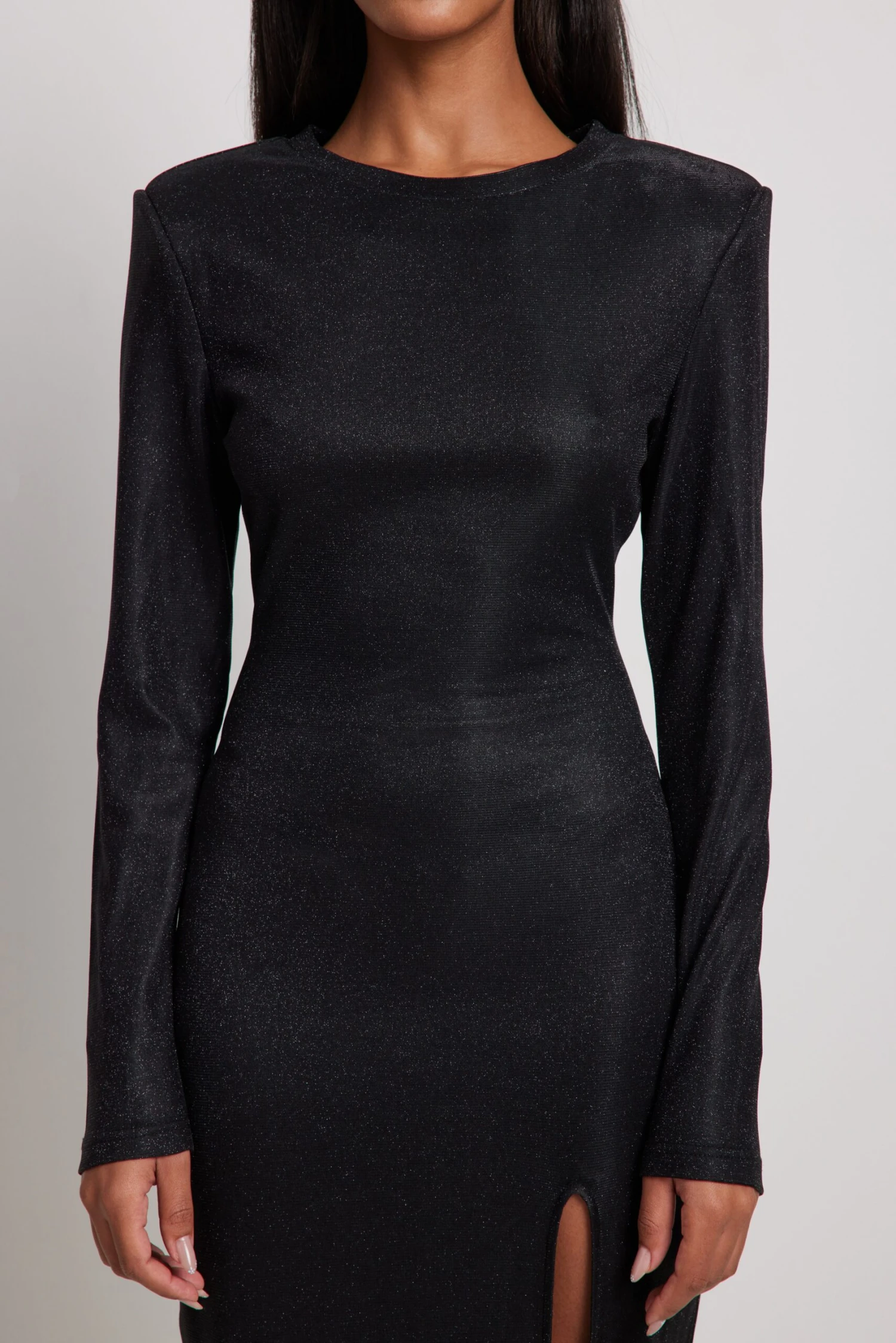 This midi dress features glitter. It has a bodycon fit and a crew neckline. This midi dress features long sleeves with padded shoulders and a high side slit.