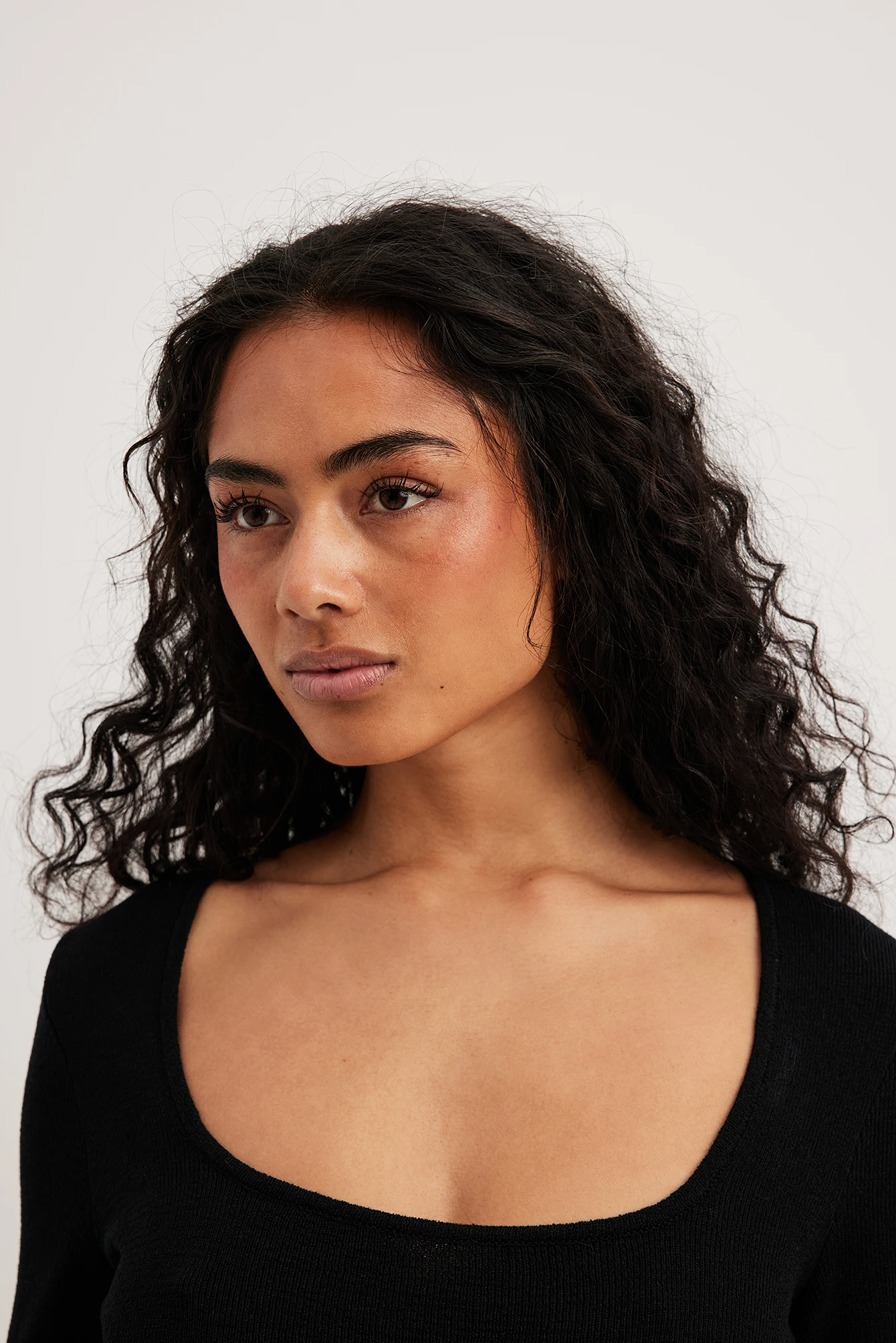 This maxi dress is knitted and stretchy and features tight fit. It has a square neckline and long sleeves. This maxi dress features a high slit detail.