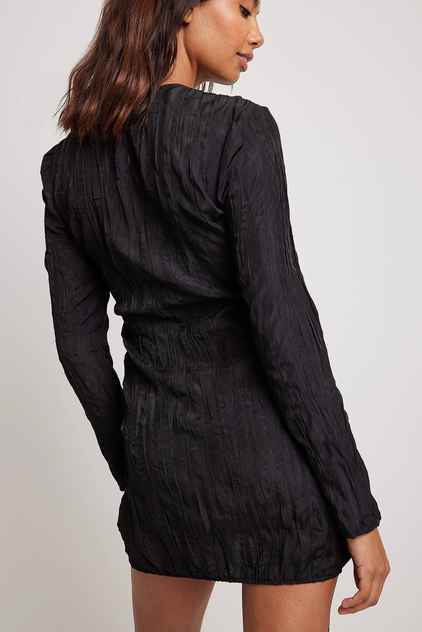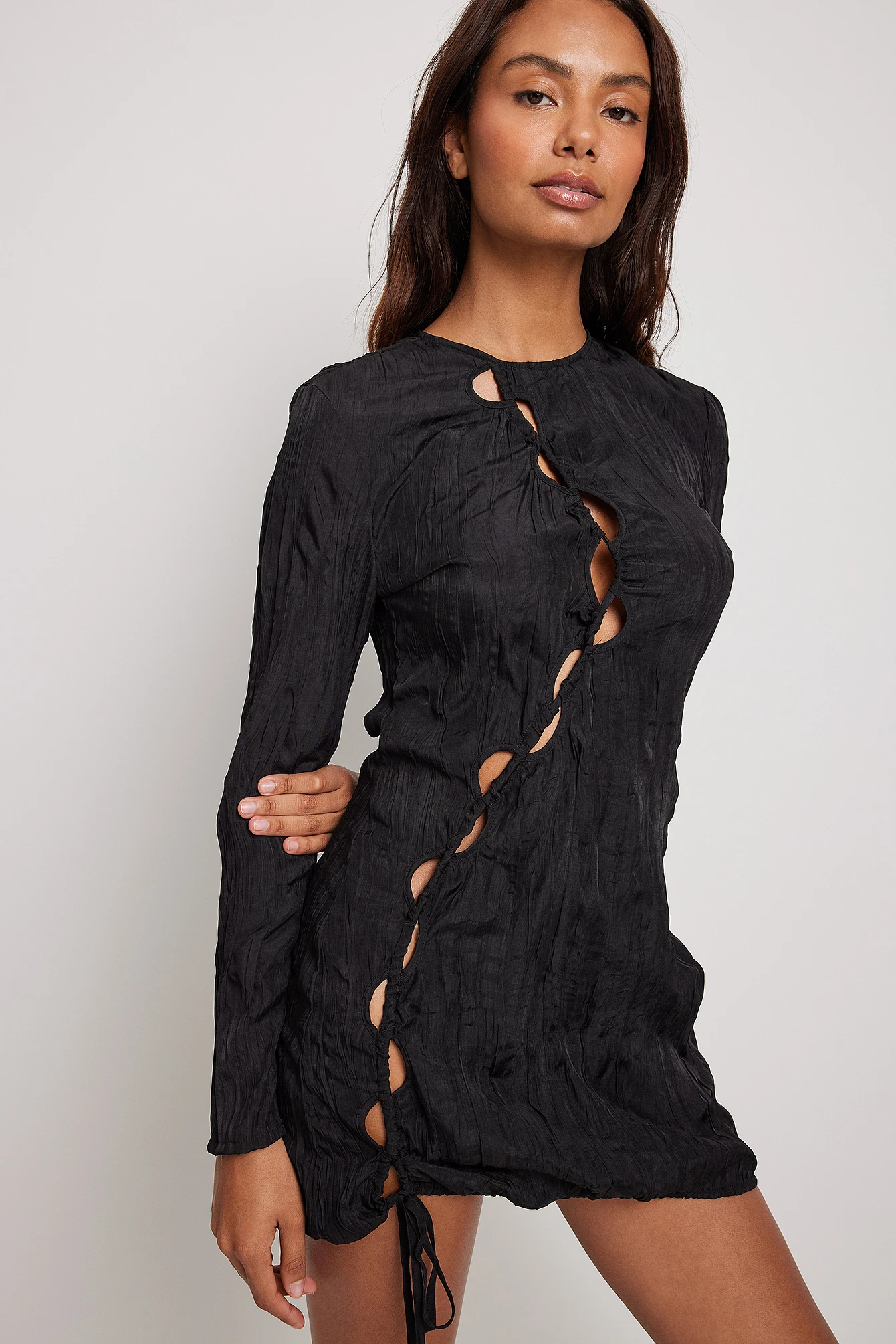 This dress features a mini length, long sleeves, a button closure at the neck, a detail with a gathered, adjustable hole with a drawstring and a structured material. A dream dress if you ask us.