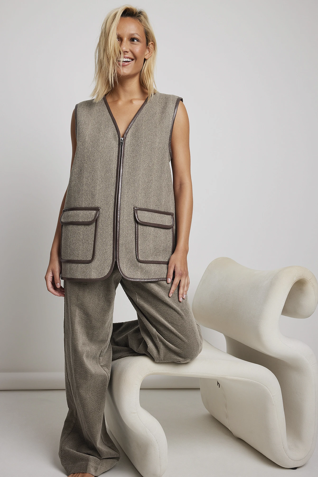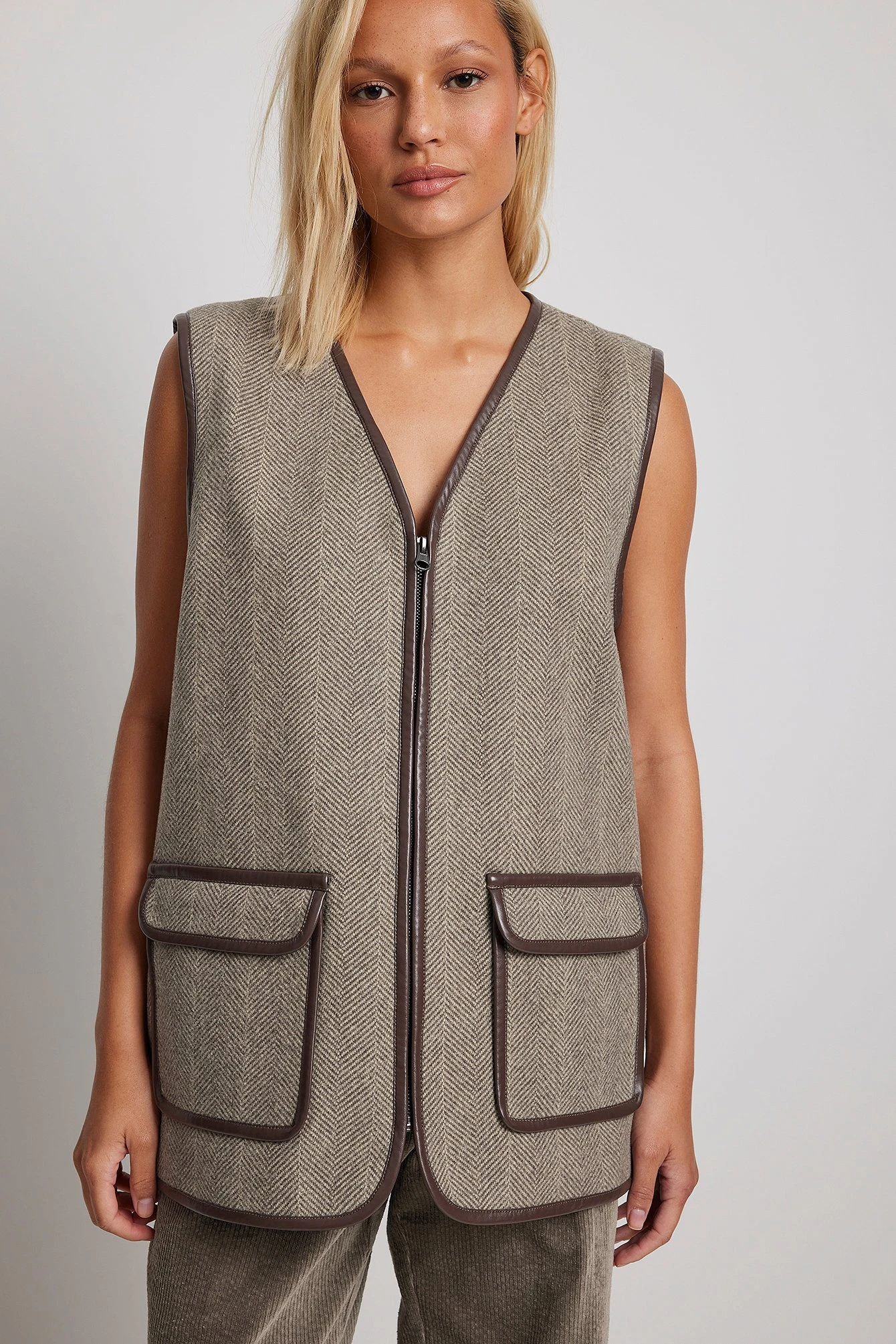 This vest is made of tweed and features faux leather details, a zipper closure, two front flap pockets and a fabric lining.