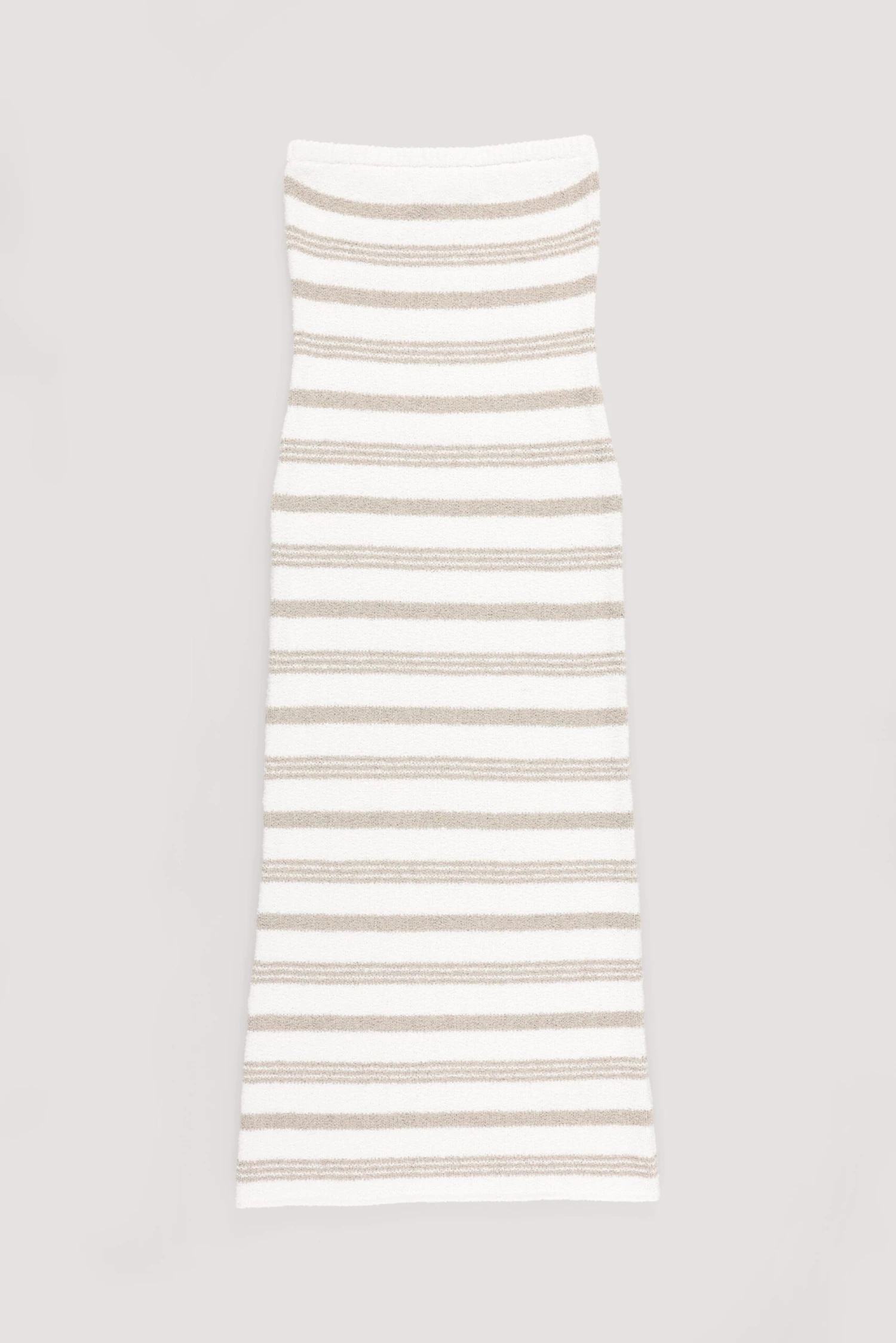 This midi dress features a stretchy knit material and a form fit. It has bandeau style and a ribbed hem at the top.