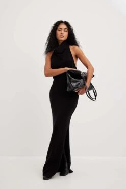 This maxi dress is knitted and features a halterneck design with a high neckline. It has a bodycon fit and a side slit.