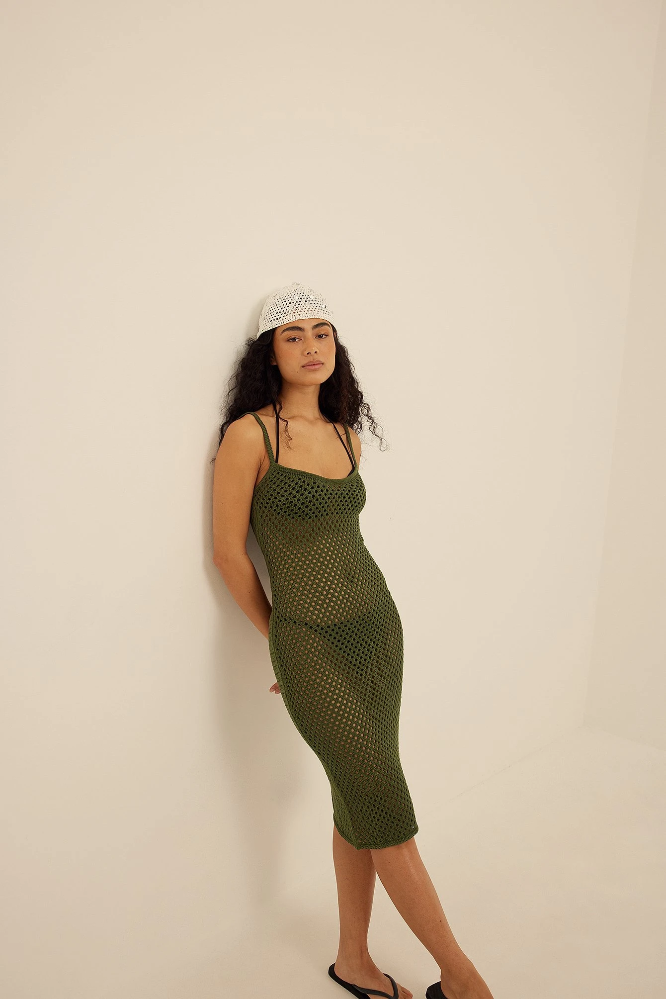 This midi dress features shoulder straps. It has a knit material with fishnet holes.