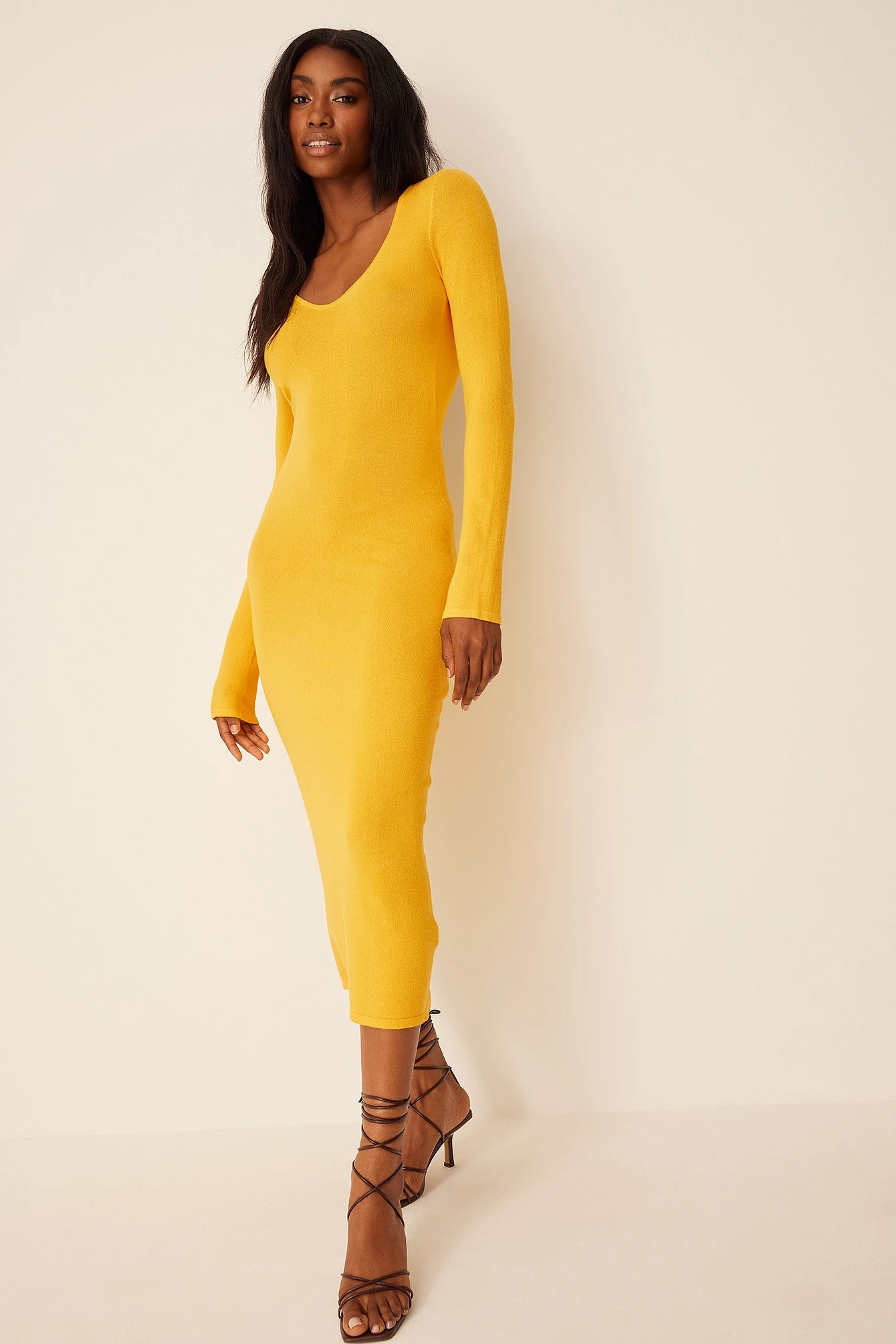 This midi dress is v-neck, knitted and elasticized and features long sleeves and an open back design.