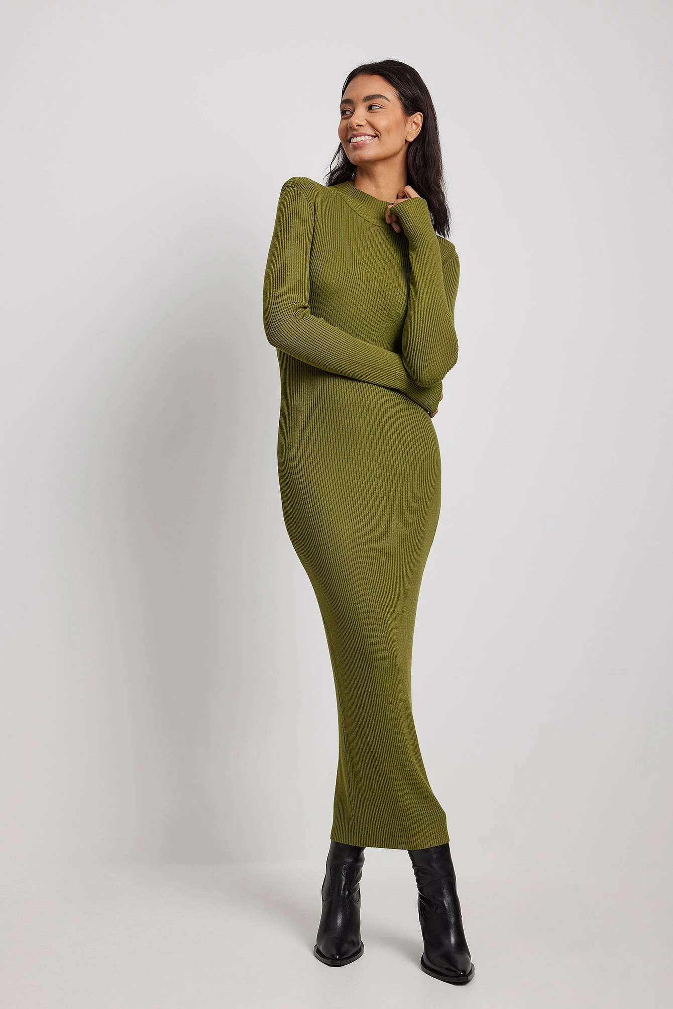 This maxi dress features a high neck, long sleeves, a knitted design and a bodycon fit.