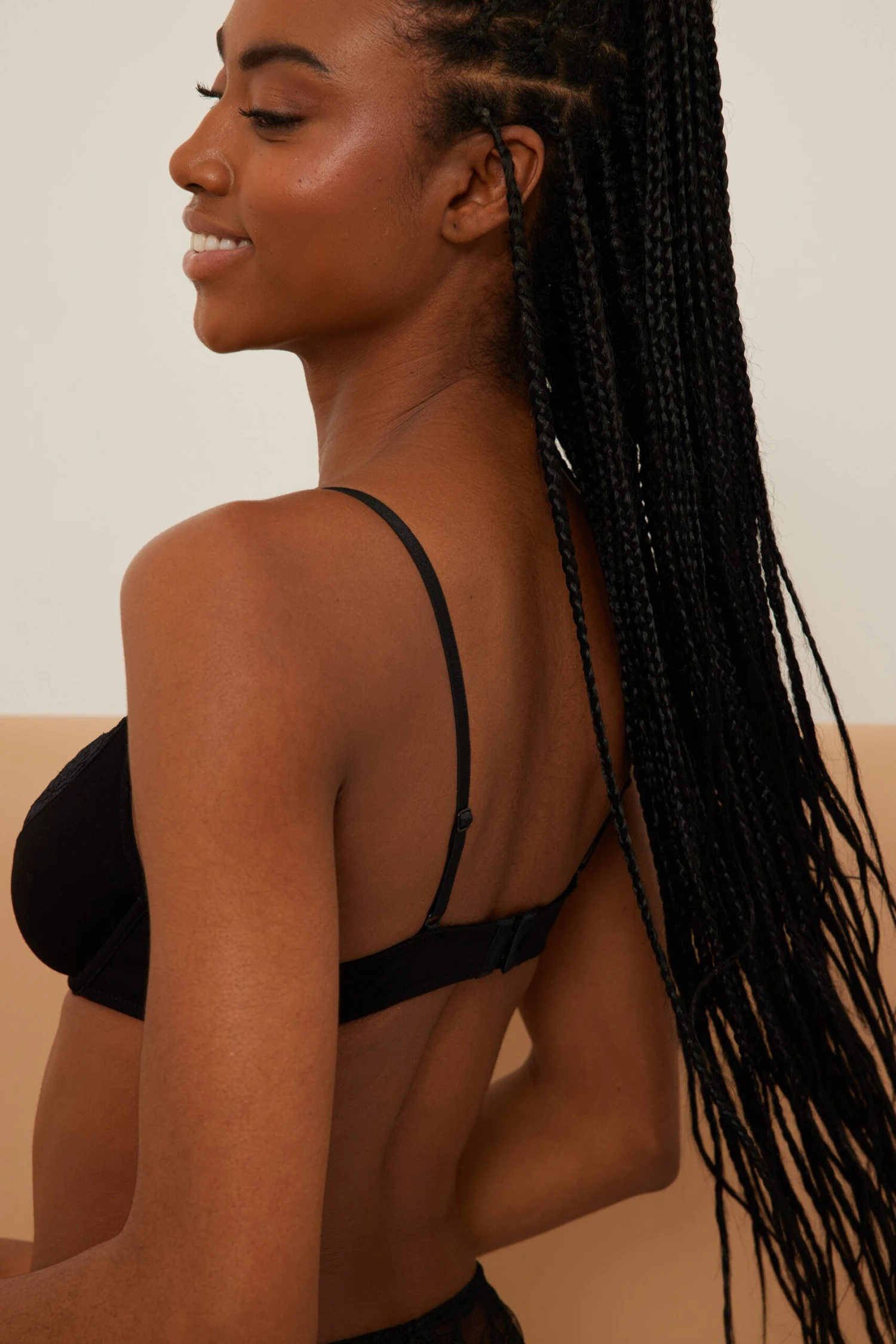 This bra features unpadded, underwired cups with hems in floral lace, adjustable, thin shoulder straps and an adjustable hook-and-eye closure.