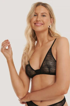 This lace bra features a seethrough, soft material, thin adjustable shoulder straps and an adjustable hook-and-eye closure at the back.