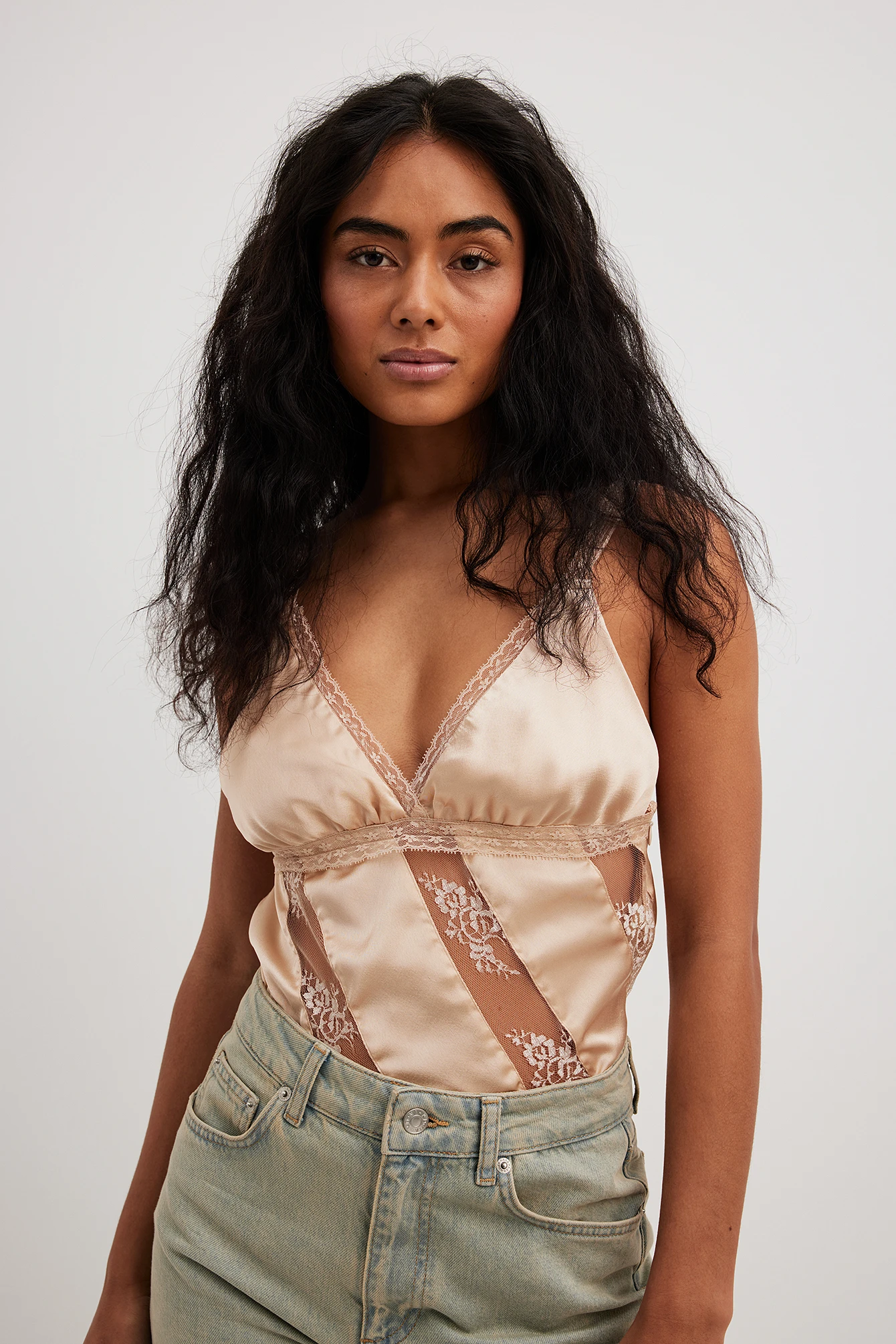 This top is made of satin and features lace detailing along the item. It has non adjustable shoulder straps in lace and soft cups. This top features a side zipper closure.