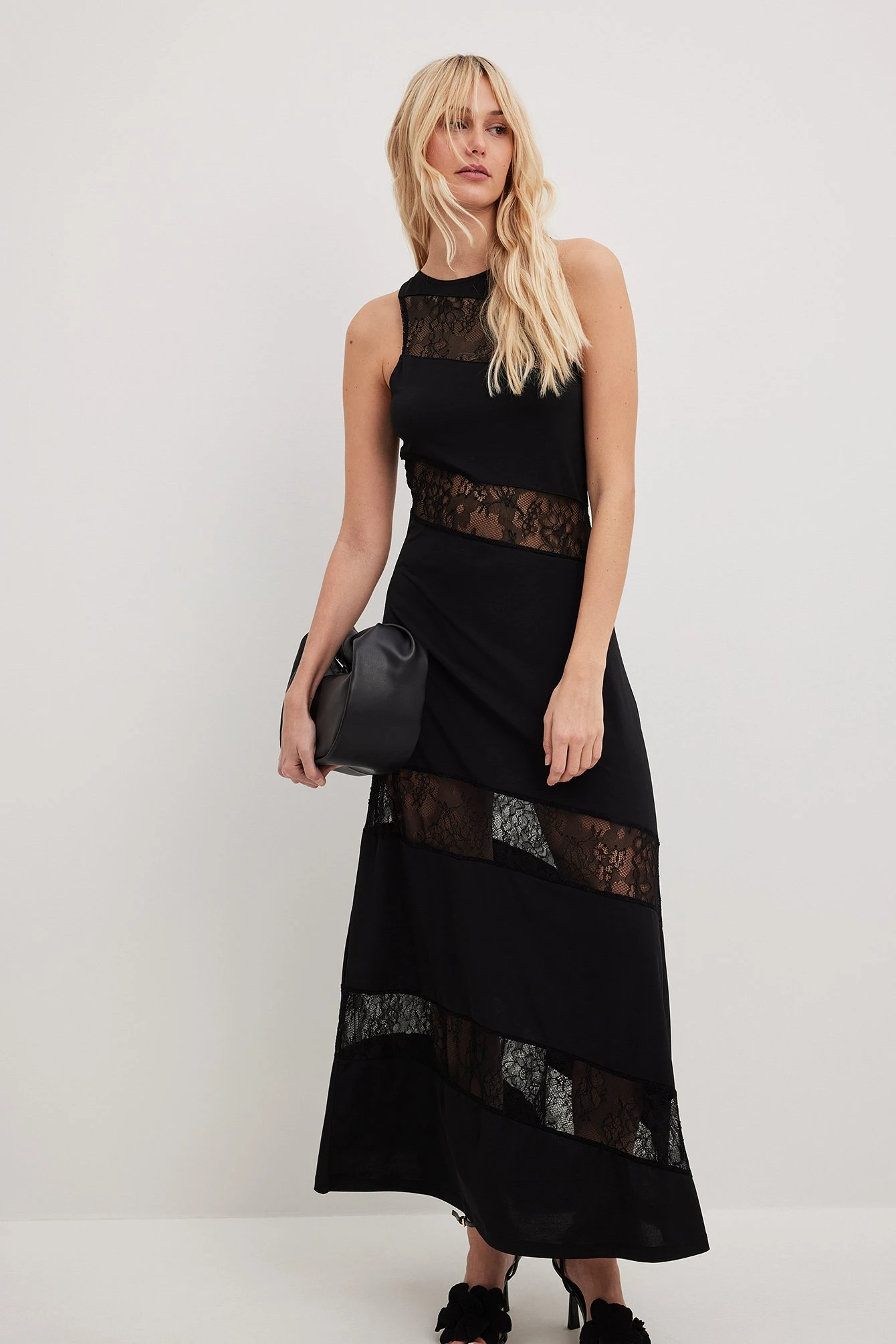 This maxi dress is sleeveless and features a flowy fit. It has lace detailing along the item and a crew neckline with a button closure on the back.