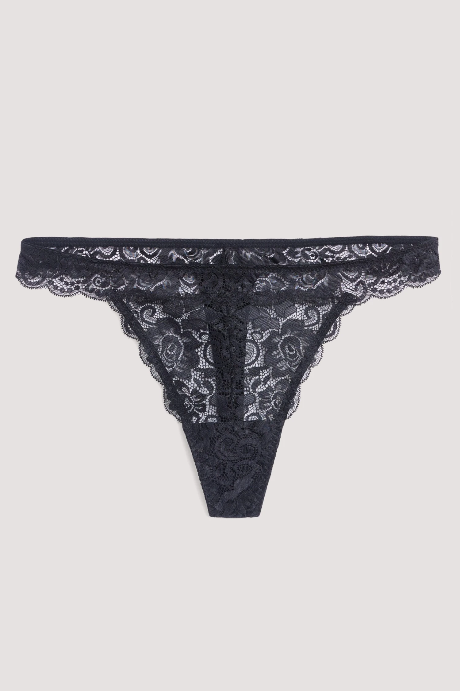 This thong features a lace design. It has a mid rise fit and a crotch lining.