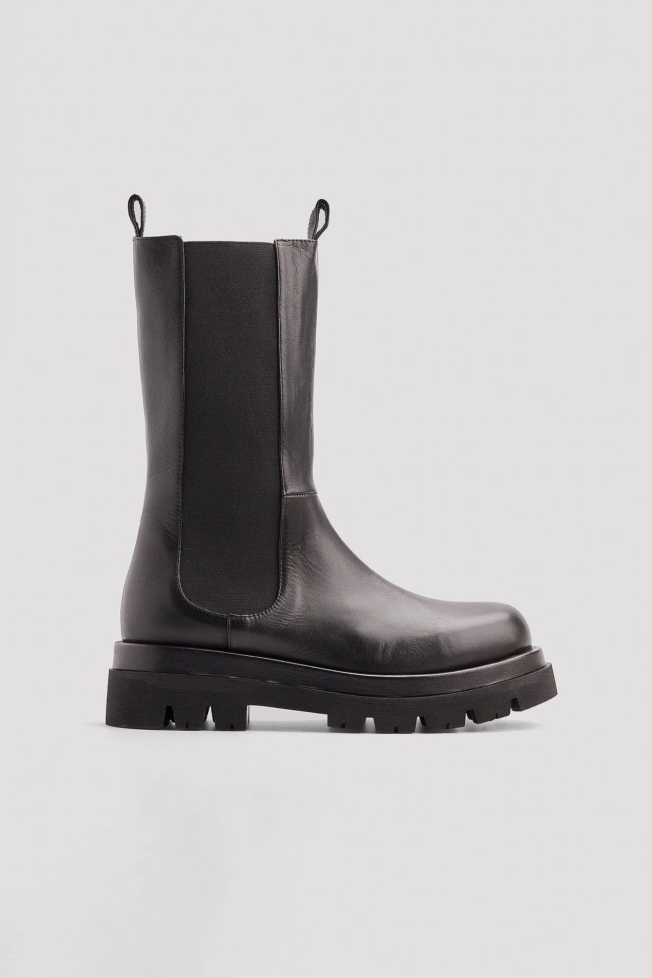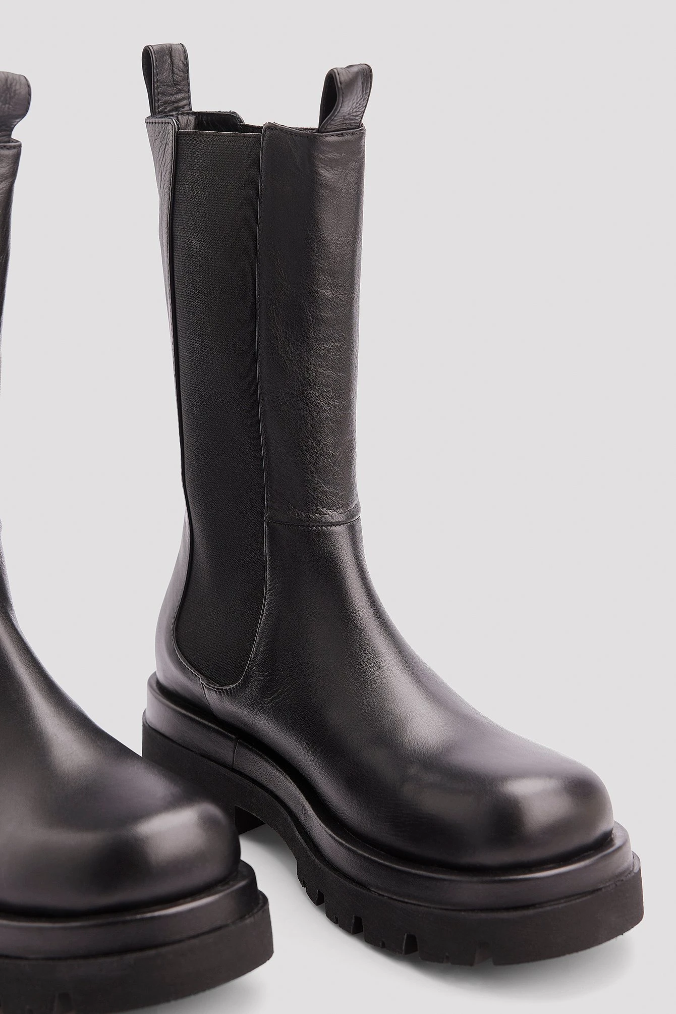 These boots are calf high, elasticized and made of leather and feature a rounded toe.