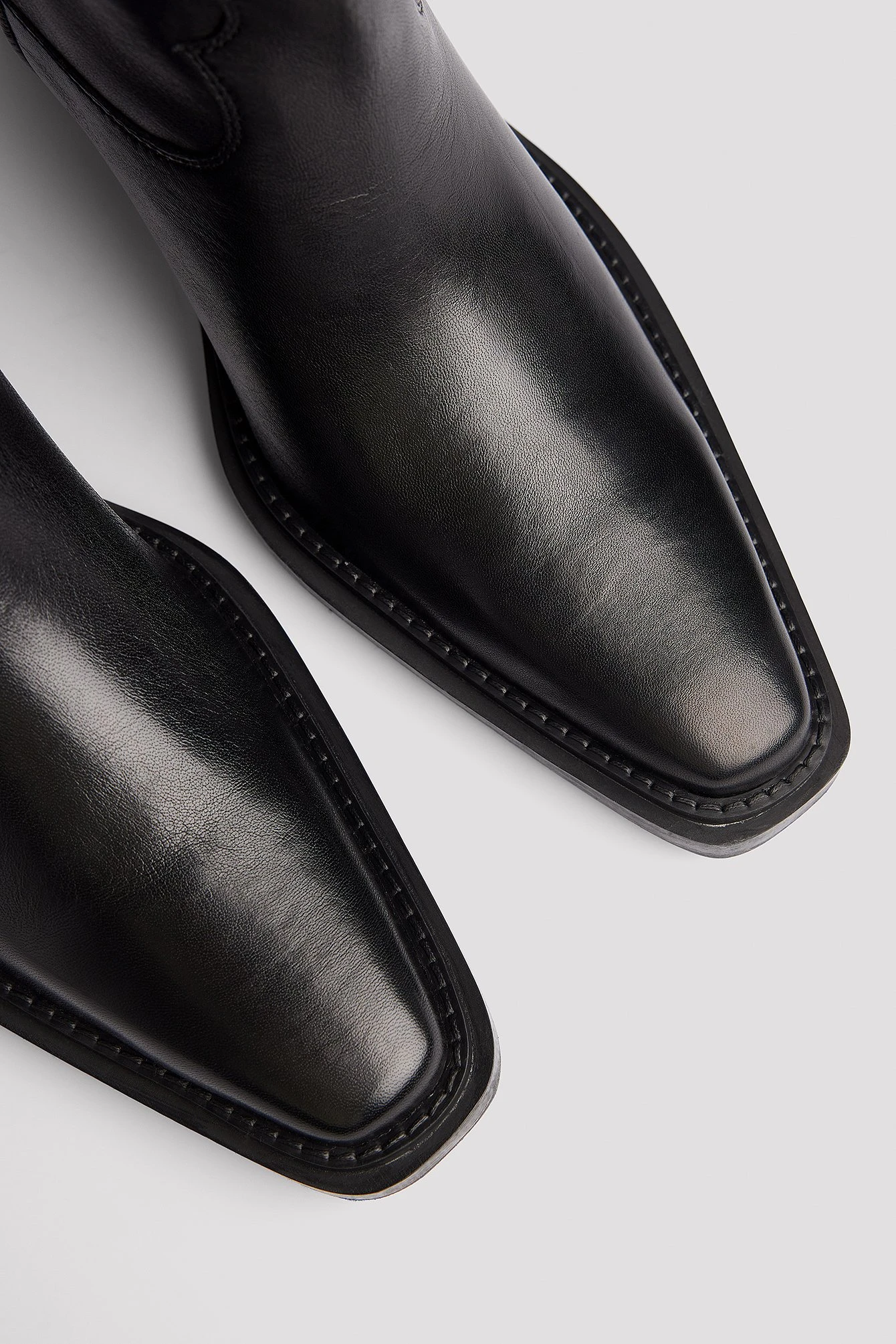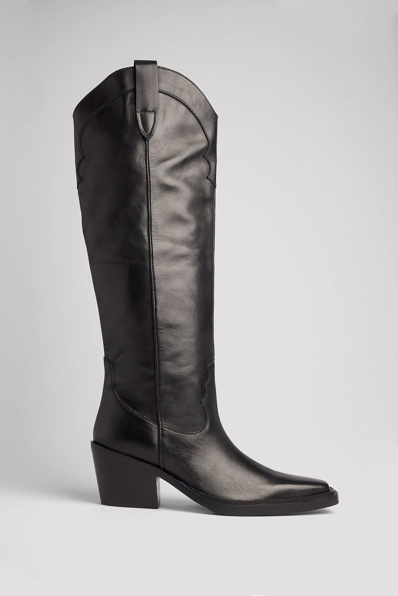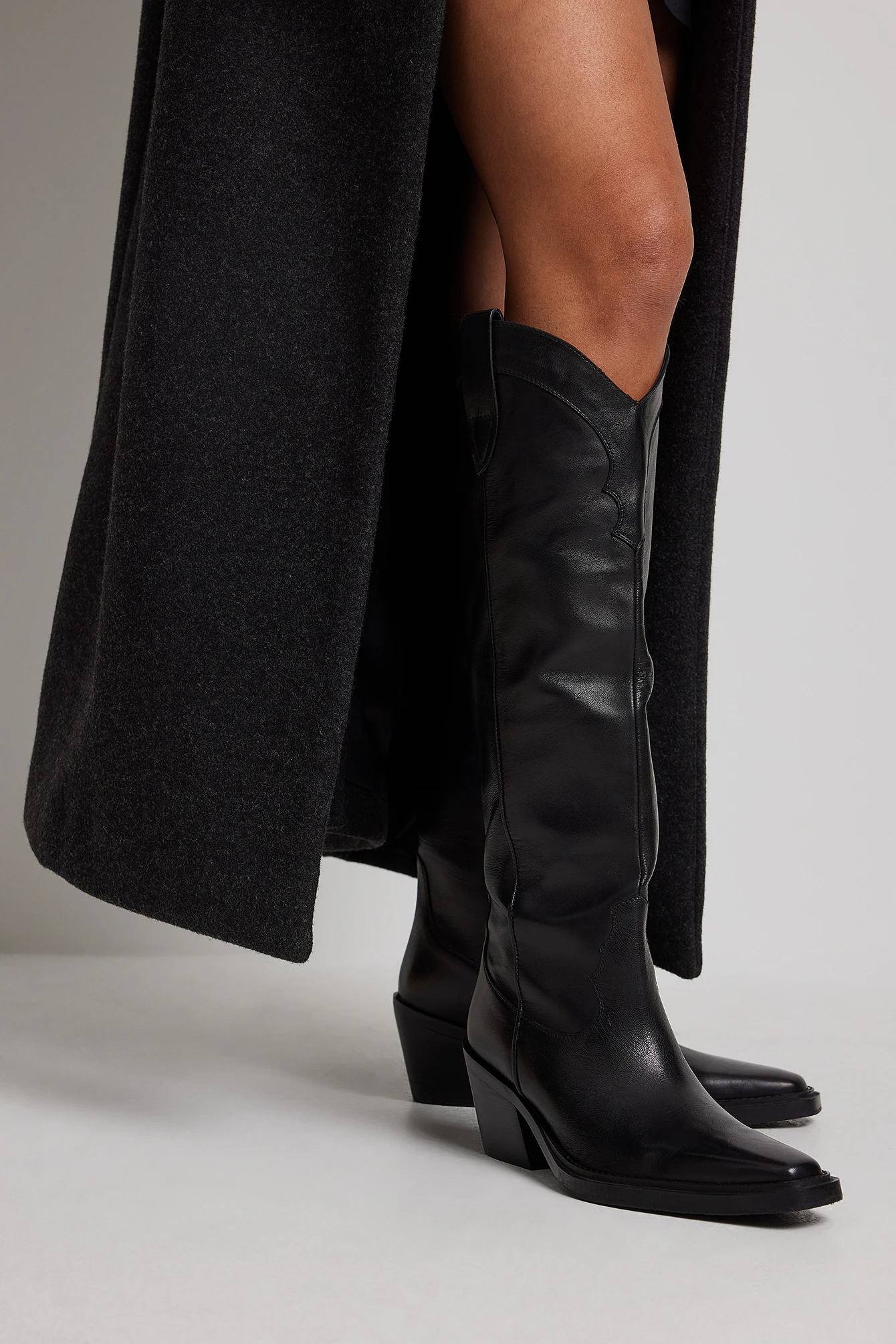 These boots are western style, knee high and made of sheep leather and feature pointed toes. They have block heels. Measurements in size 39: Heel height: 7 cm / 2.75 in. Shaft height: 37 cm / 14.56 in. Shaft circumference around the calf: 35 cm / 13.77 in.