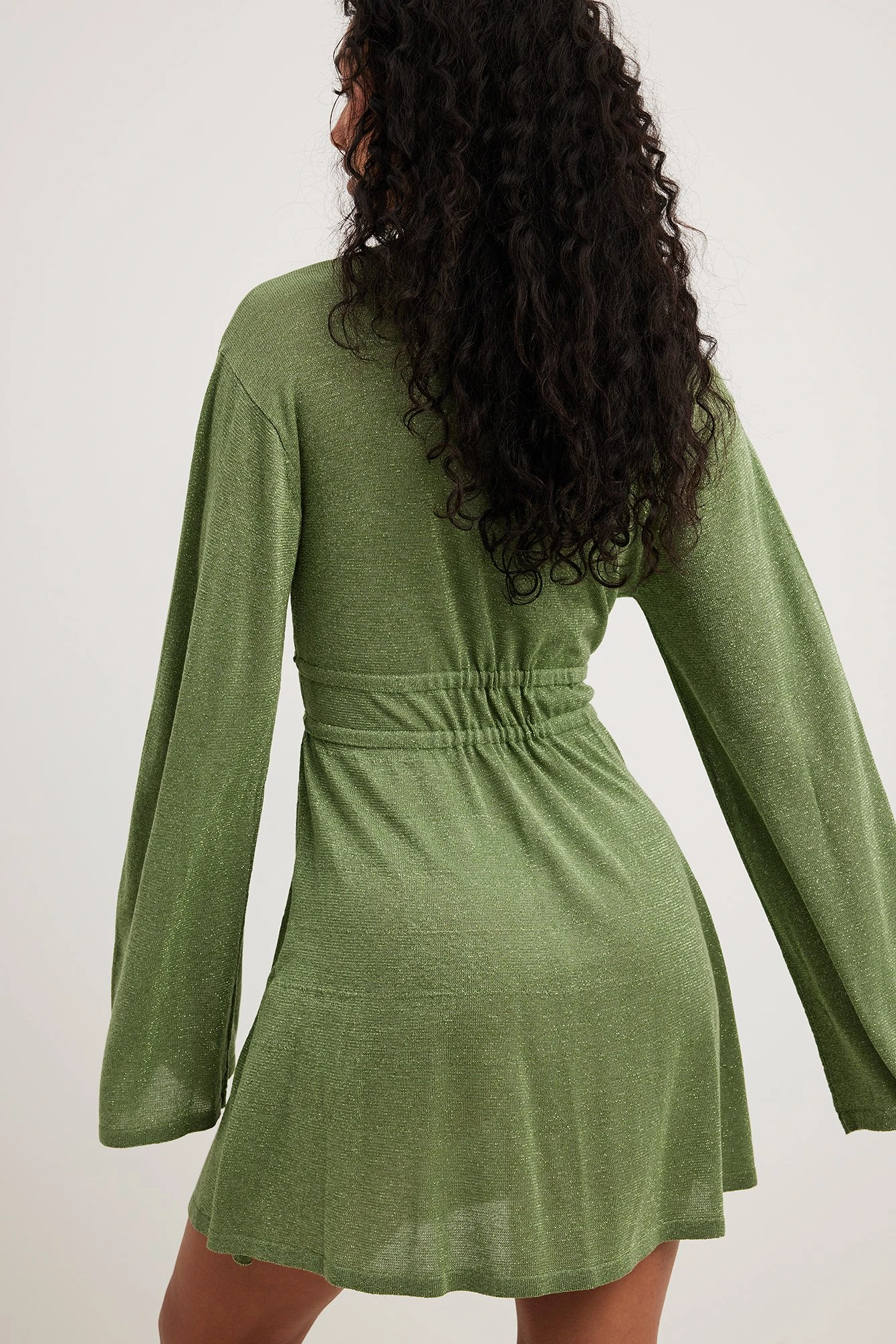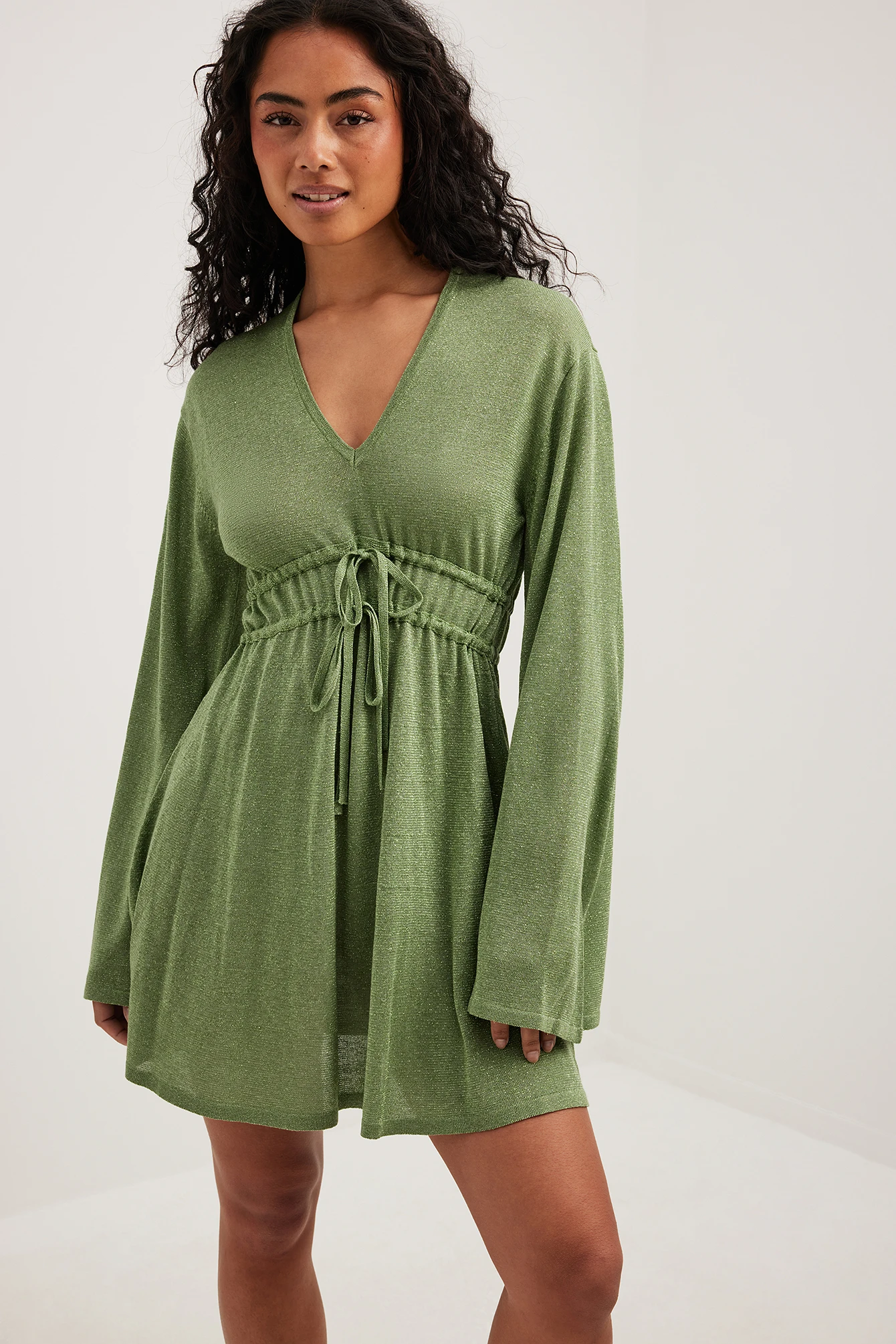 This mini dress features a glittery knit material. It has a flowy fit and a v neckline. This mini dress features wide long sleeves and self-tie drawstrings at the waist.