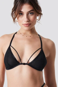 This bralette by Pamela Reif x NA-KD features a hook closure in front, a mesh cup, a triangle cup and thin and adjustable straps on the back and on the front.