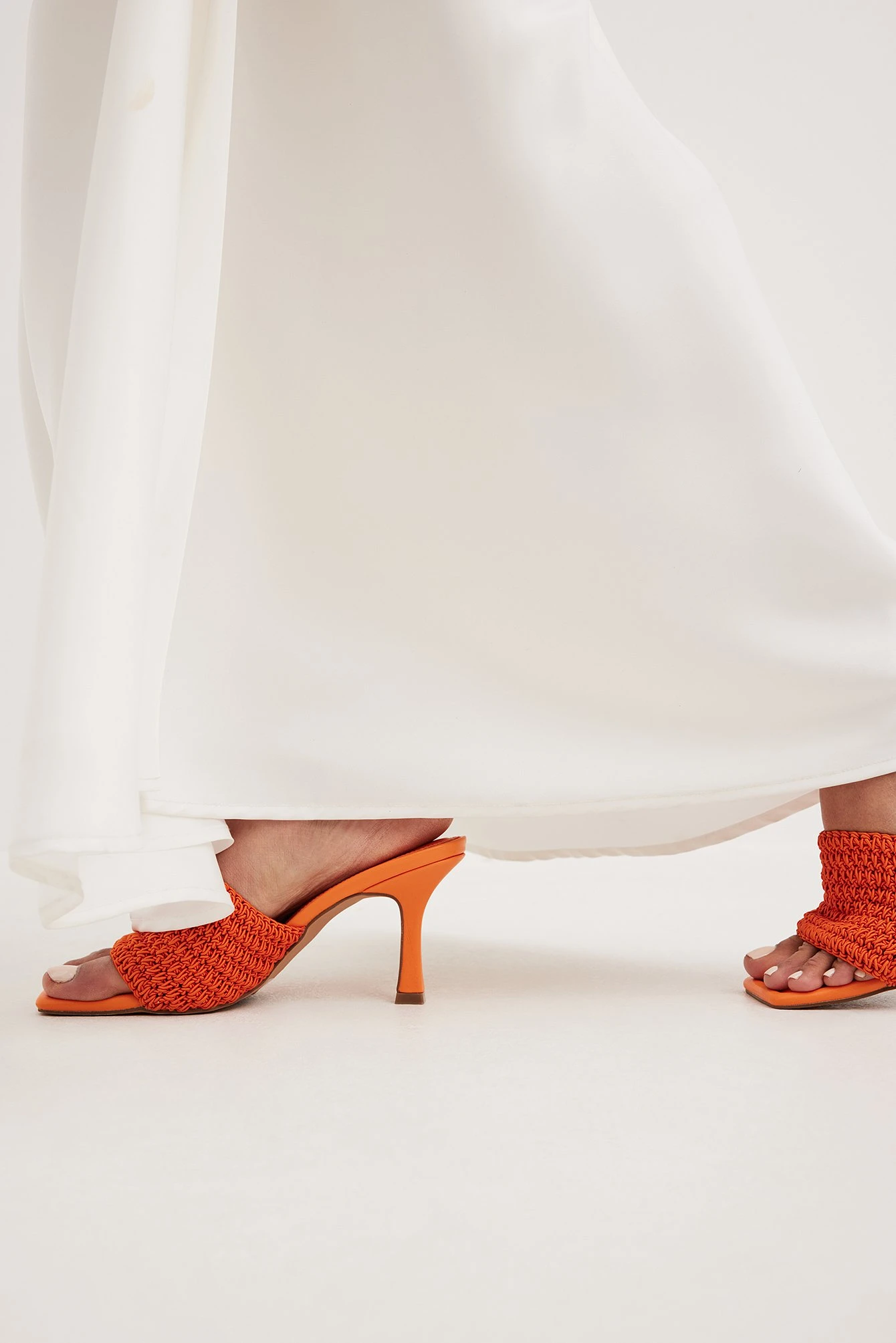 These mules feature a peep toe. They have a heeled sandal and an open back. Measurements in size 39: Heel height: 8 cm / 3.1 in.
