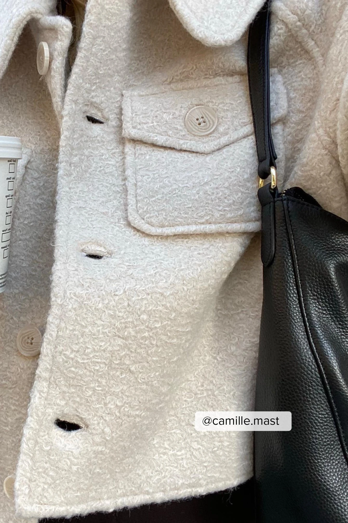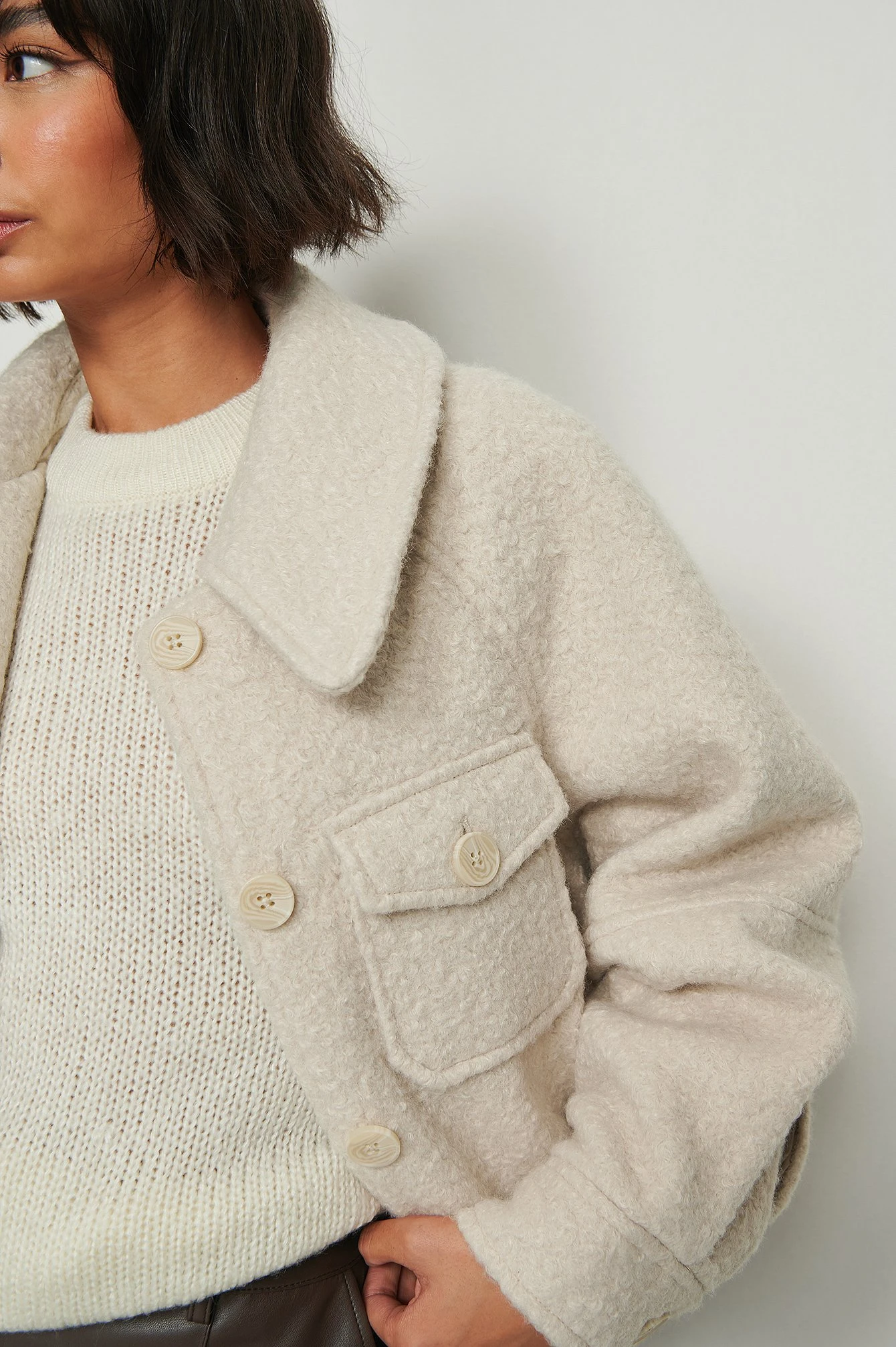 This jacket features an oversized fit, a cropped design, 2 front flap pockets with a button closure, a shirt collar and volume long sleeves with button cuffs.