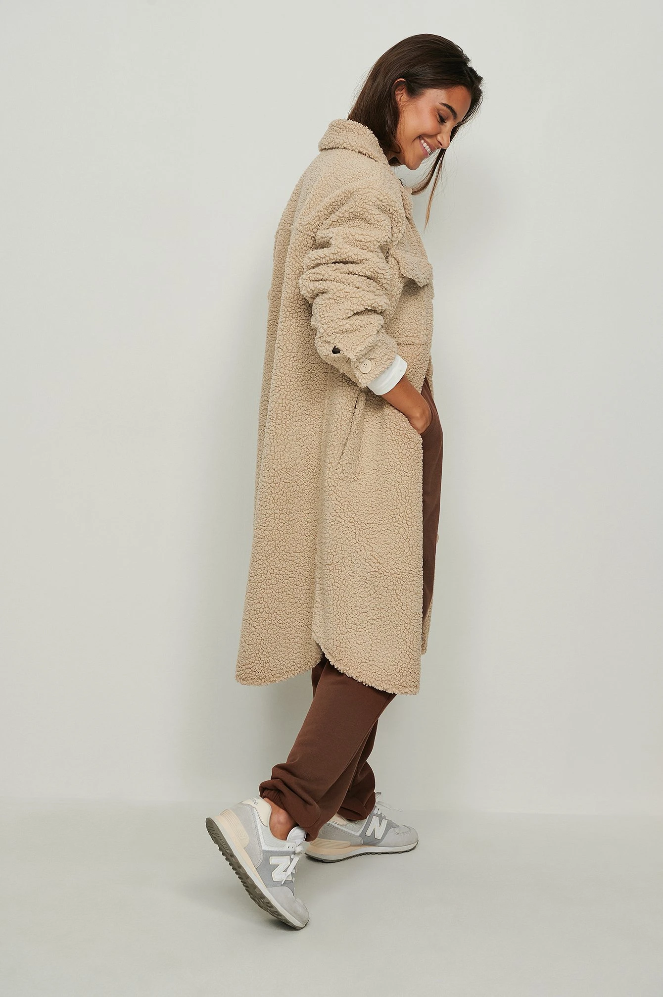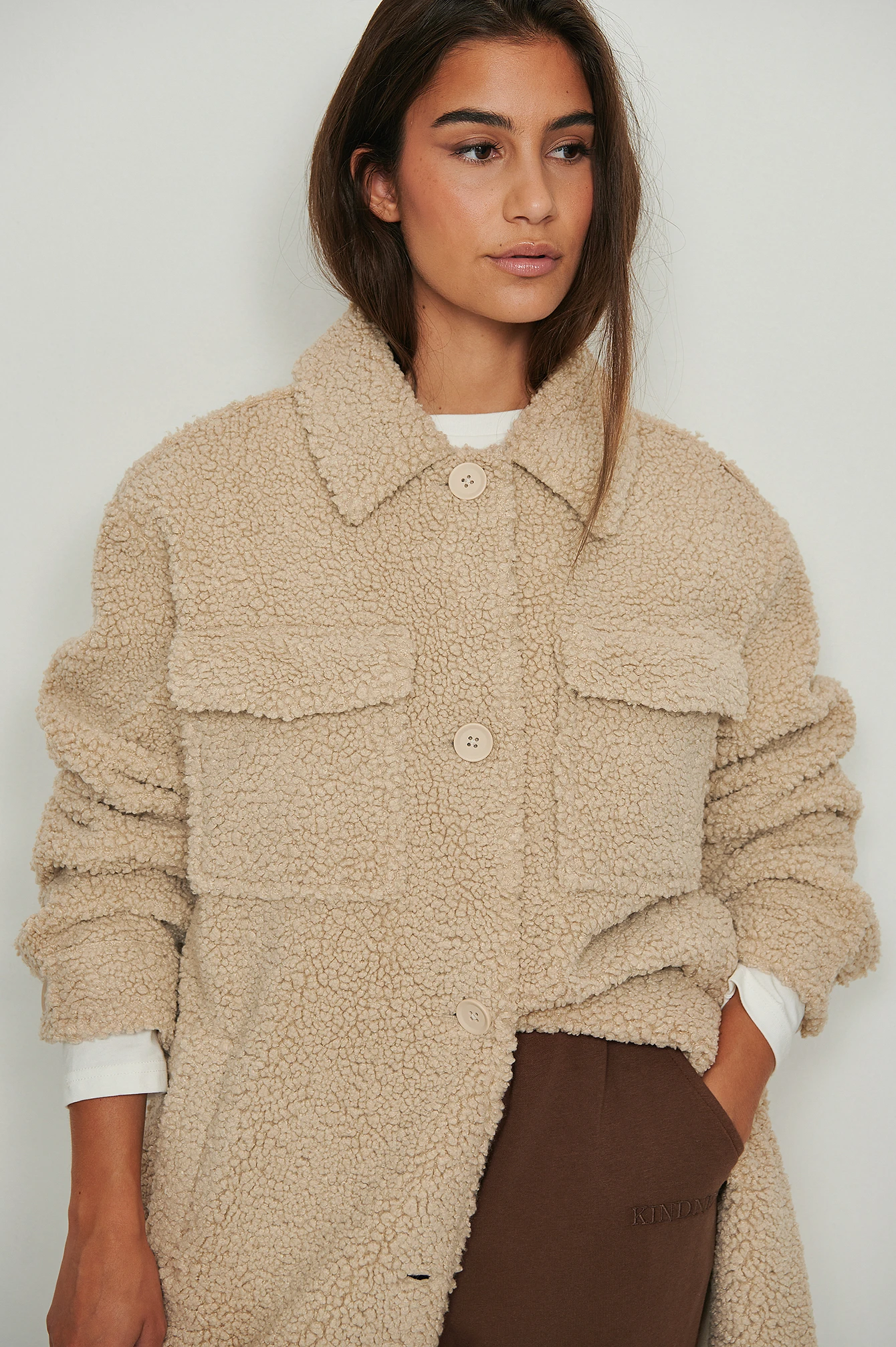 This overshirt features a teddy material with 2 front flap pockets. It has a button closure and side pockets. This overshirt features long sleeves with button details.