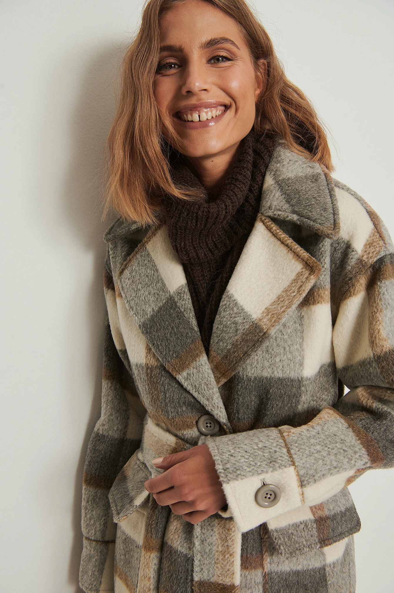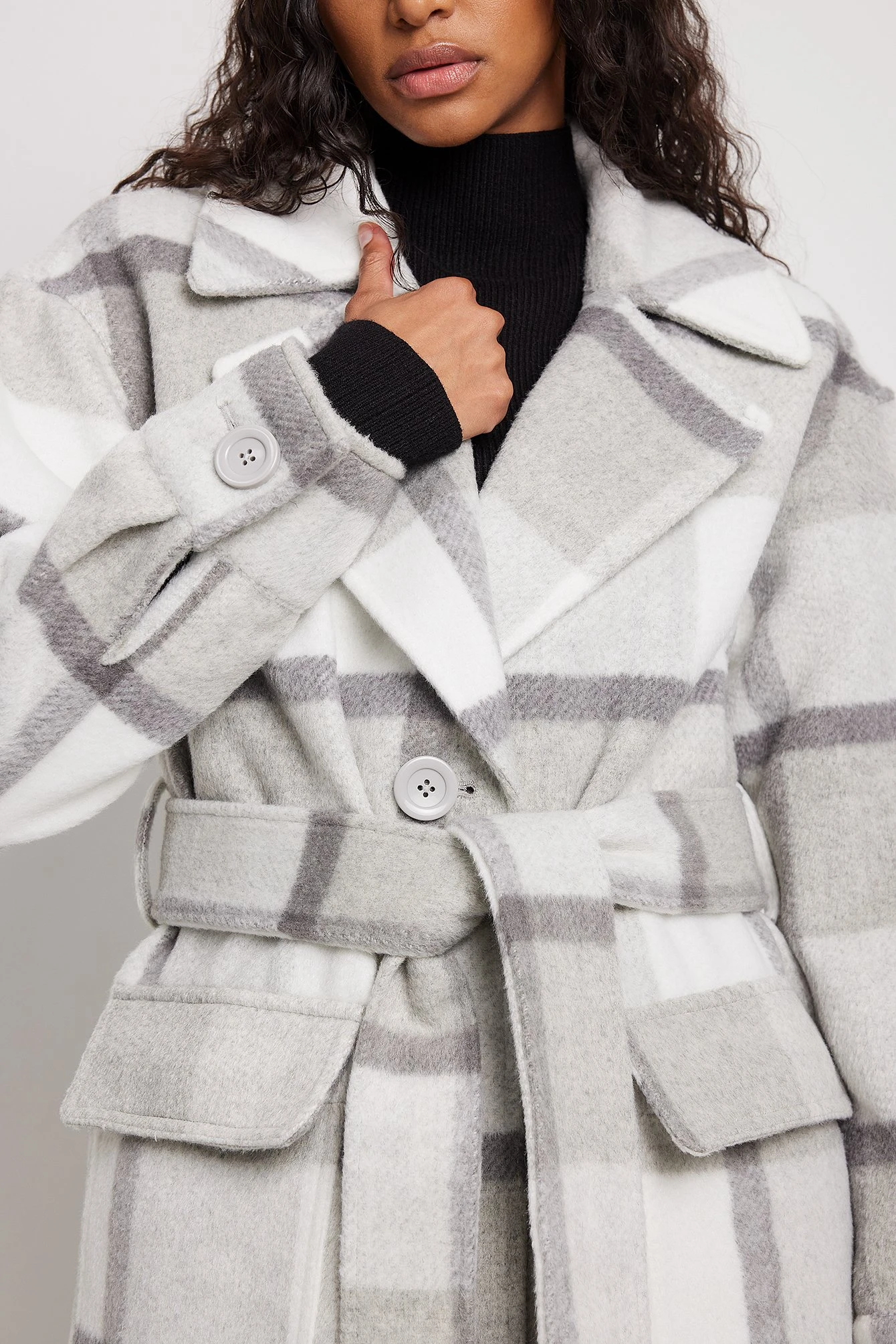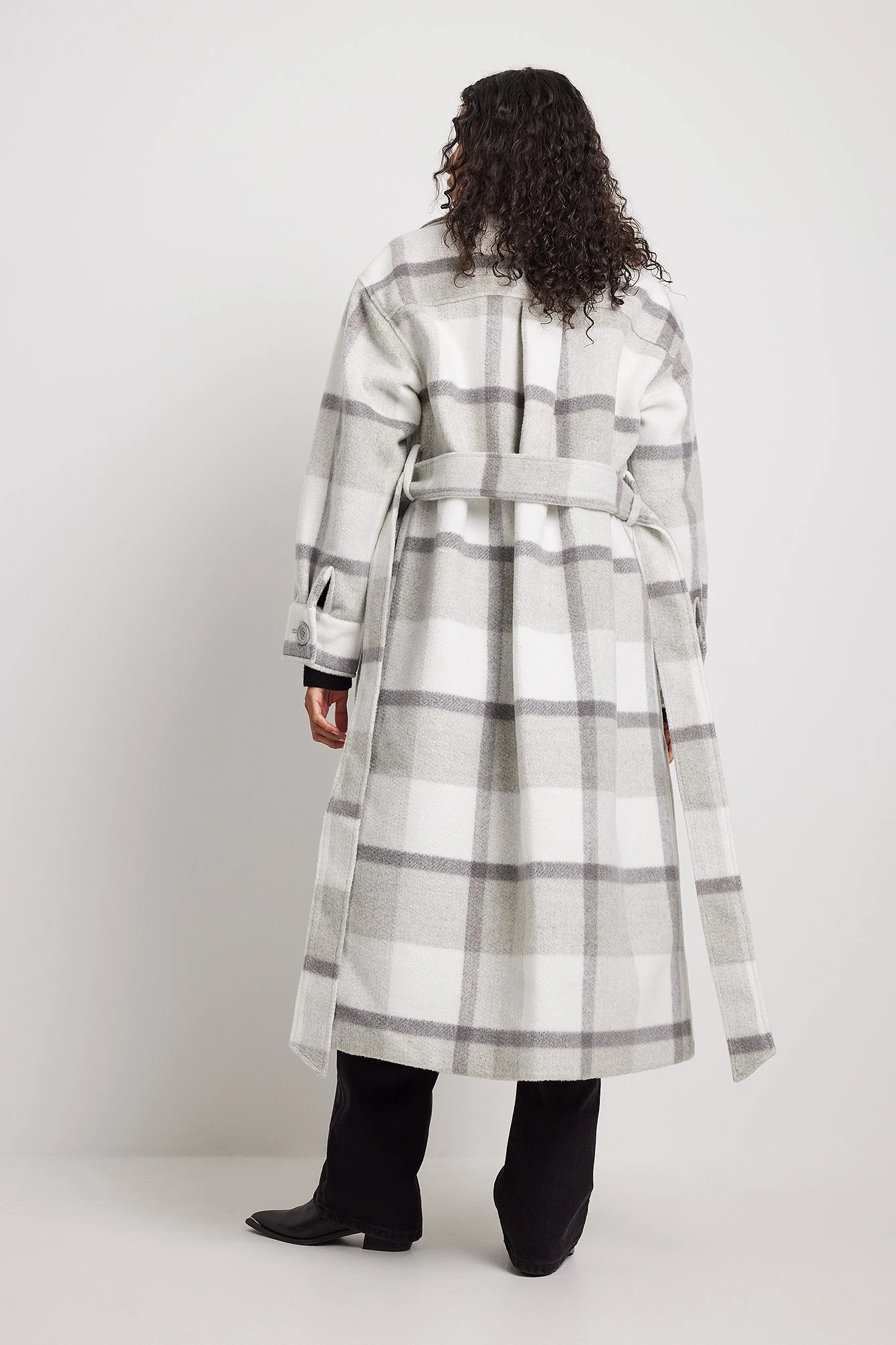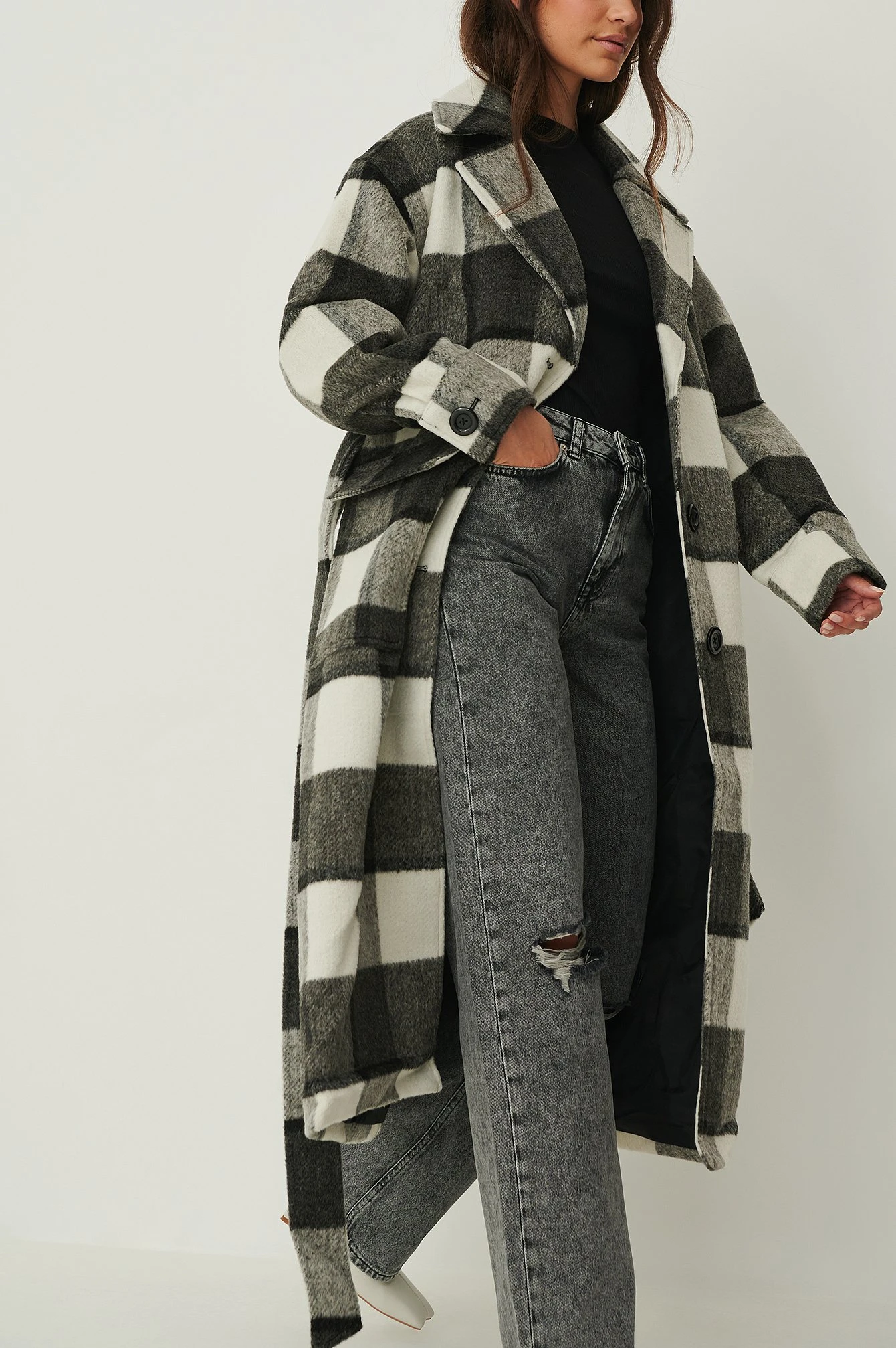 This coat features a lapel neckline, long sleeves with button cuffs on the ends, a button closure down the front, two front flap pockets, belt loops at the waist with a removable self-tie band, a long, oversized fit and a lining.
