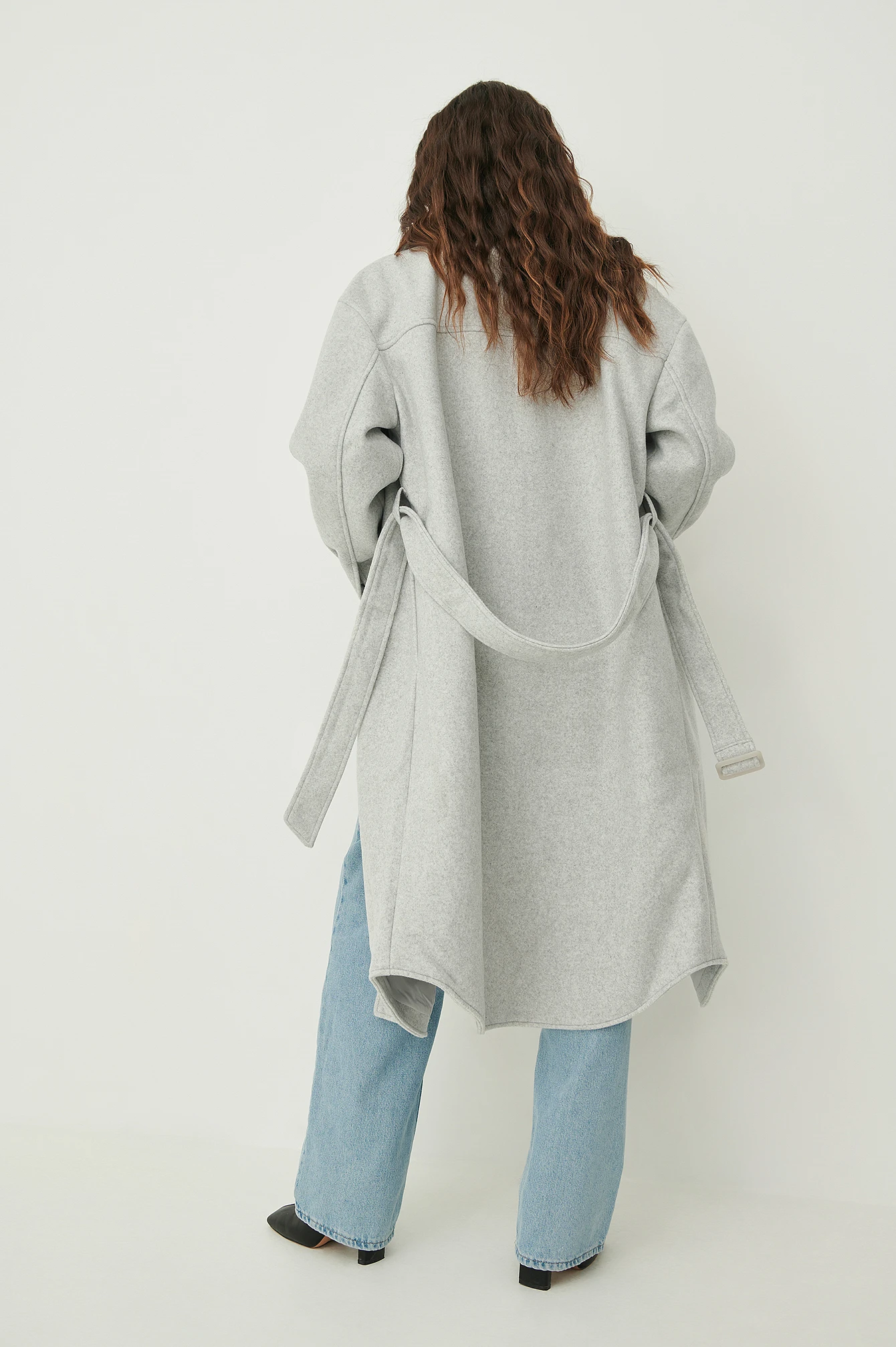 This jacket features a classic collar, long sleeves with one button closure at the cuffs, two front flap pockets on the chest, a button closure, a self-tie belt at the waist with a buckle closure, two belt loops, full underlining, a longer style and a soft, cozy, warm material.