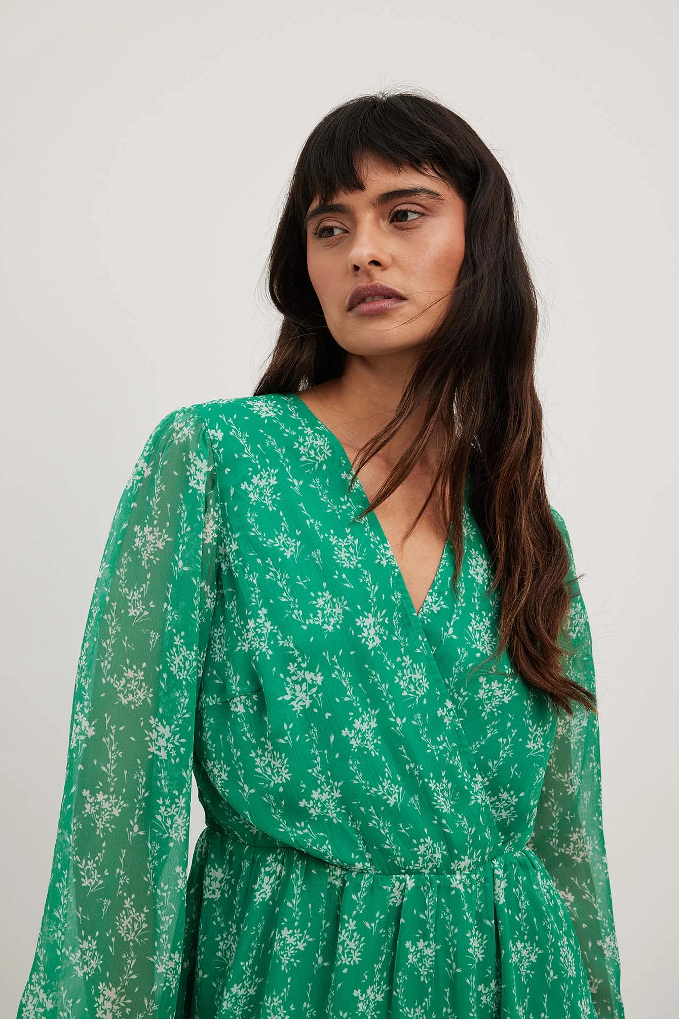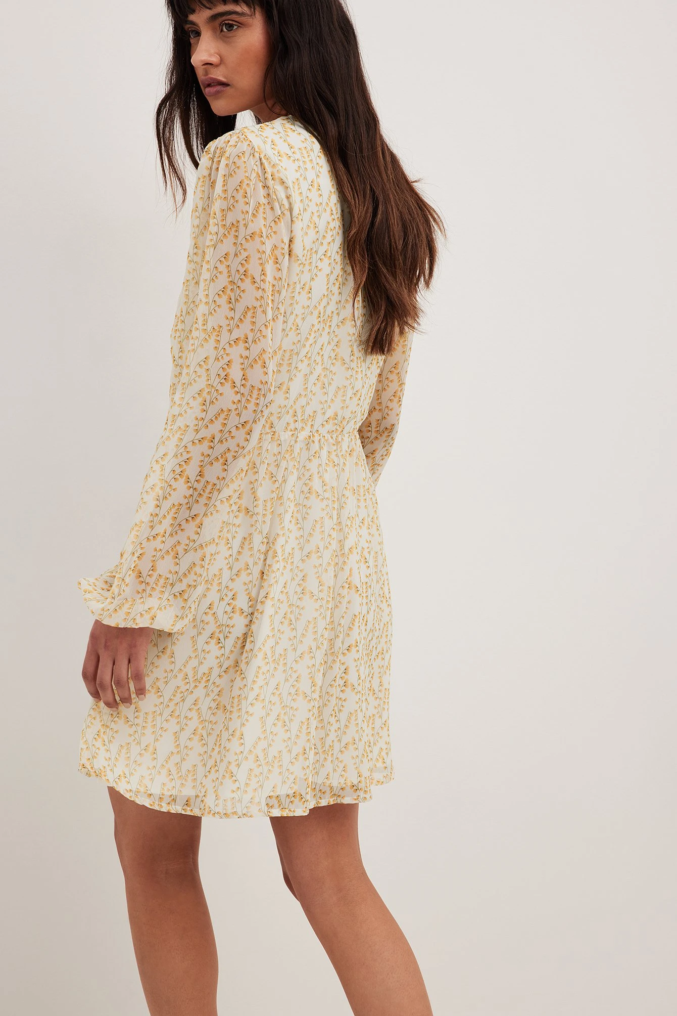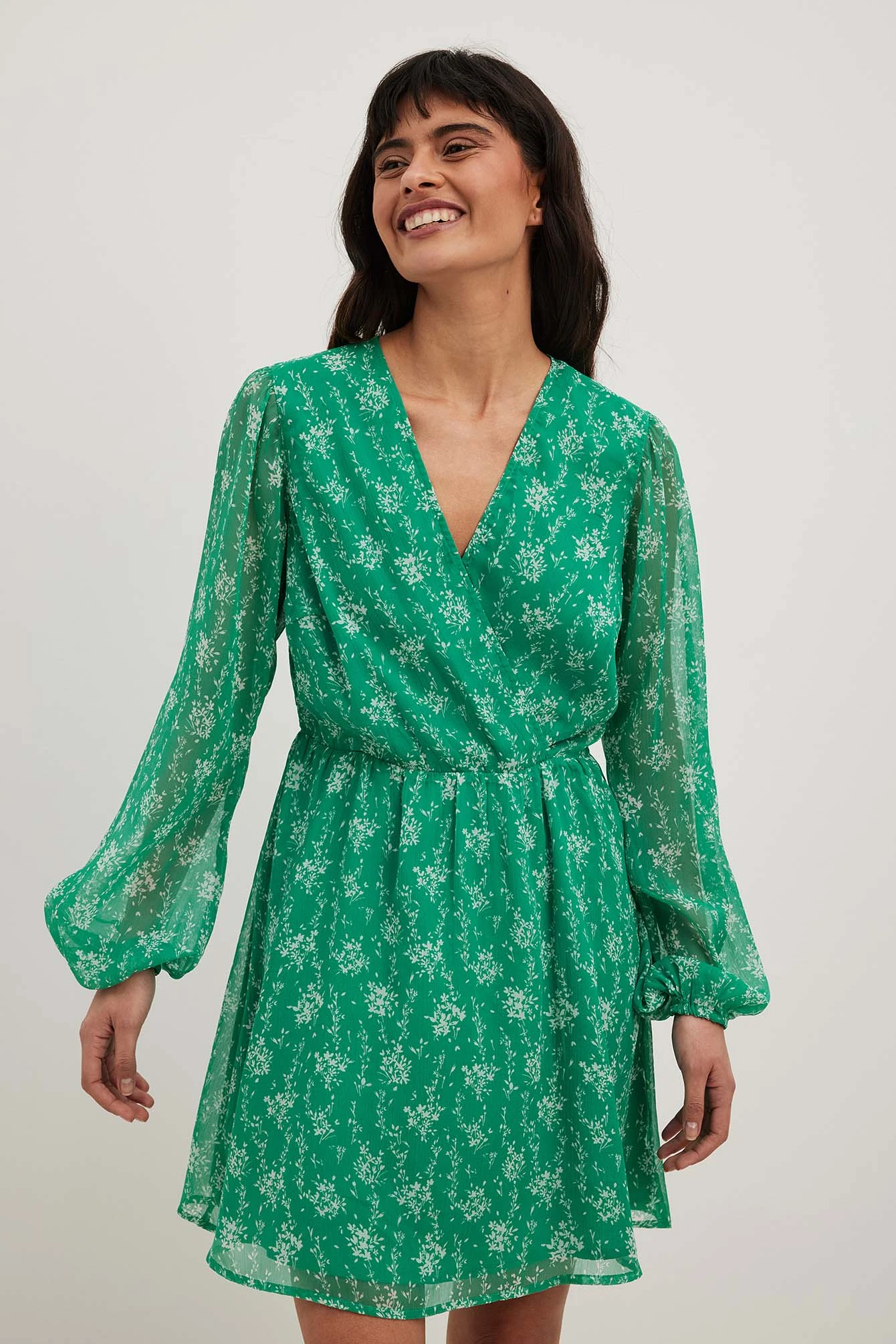 This mini dress is made of chiffon and features a flowy fit. It has a v neckline with an overlap detail and long puff sleeves with elasticized cuffs. This mini dress features a hidden side zipper closure and a lining.