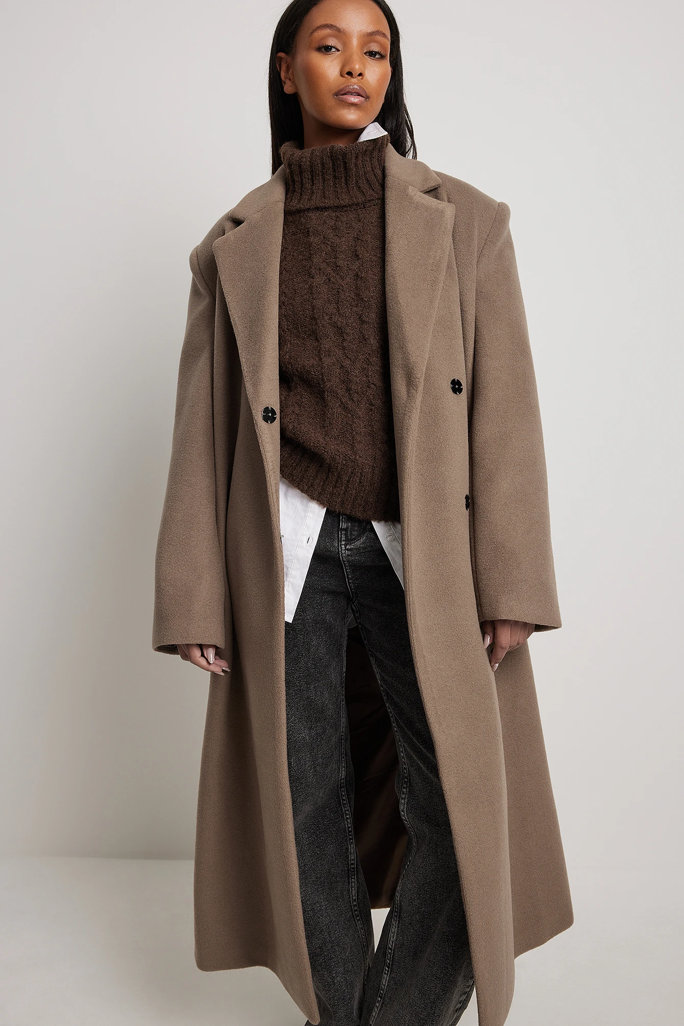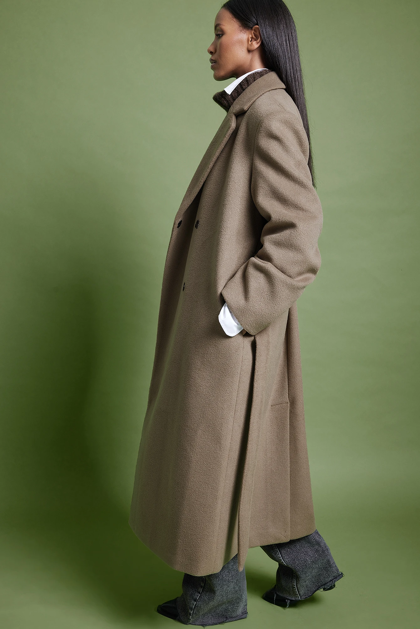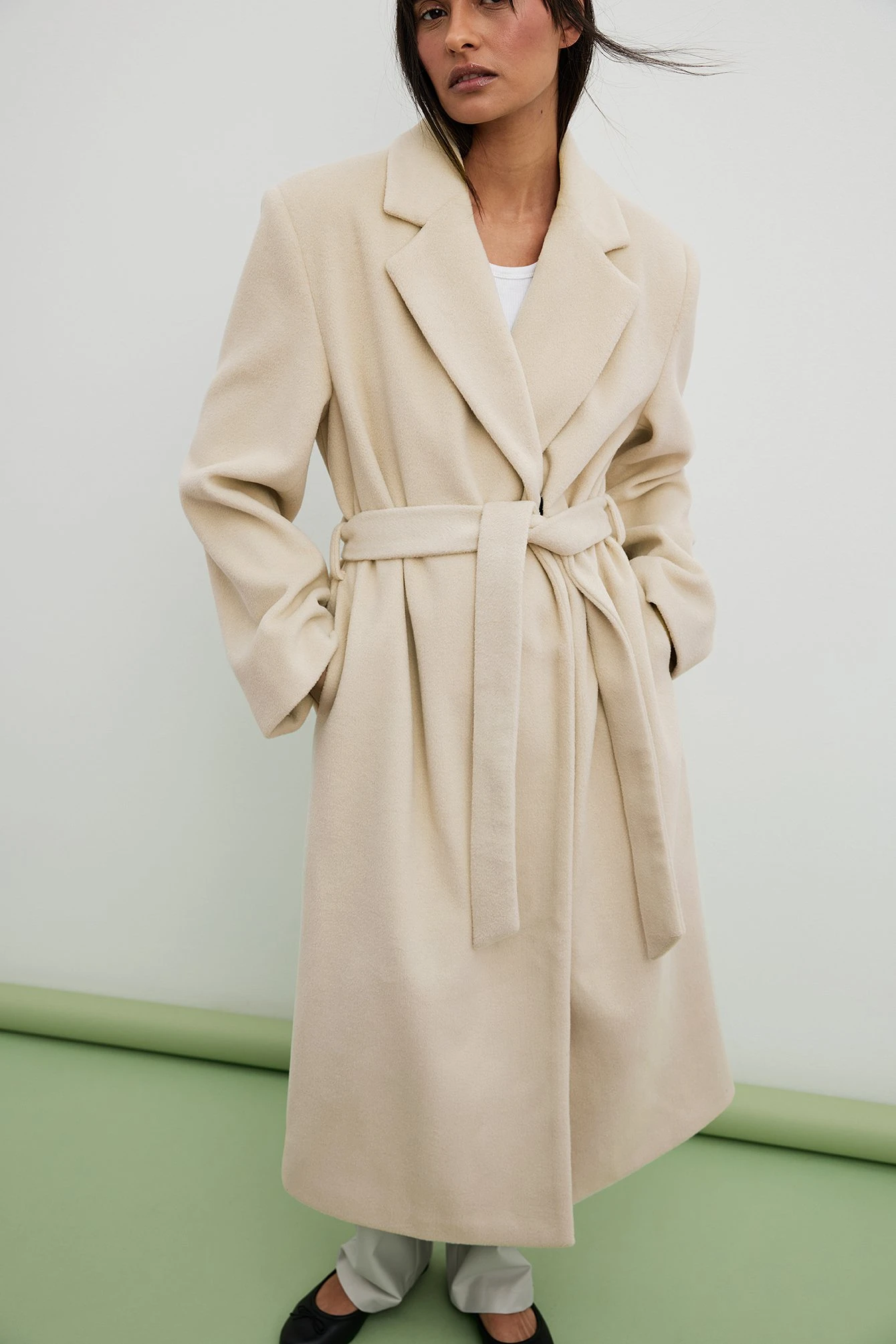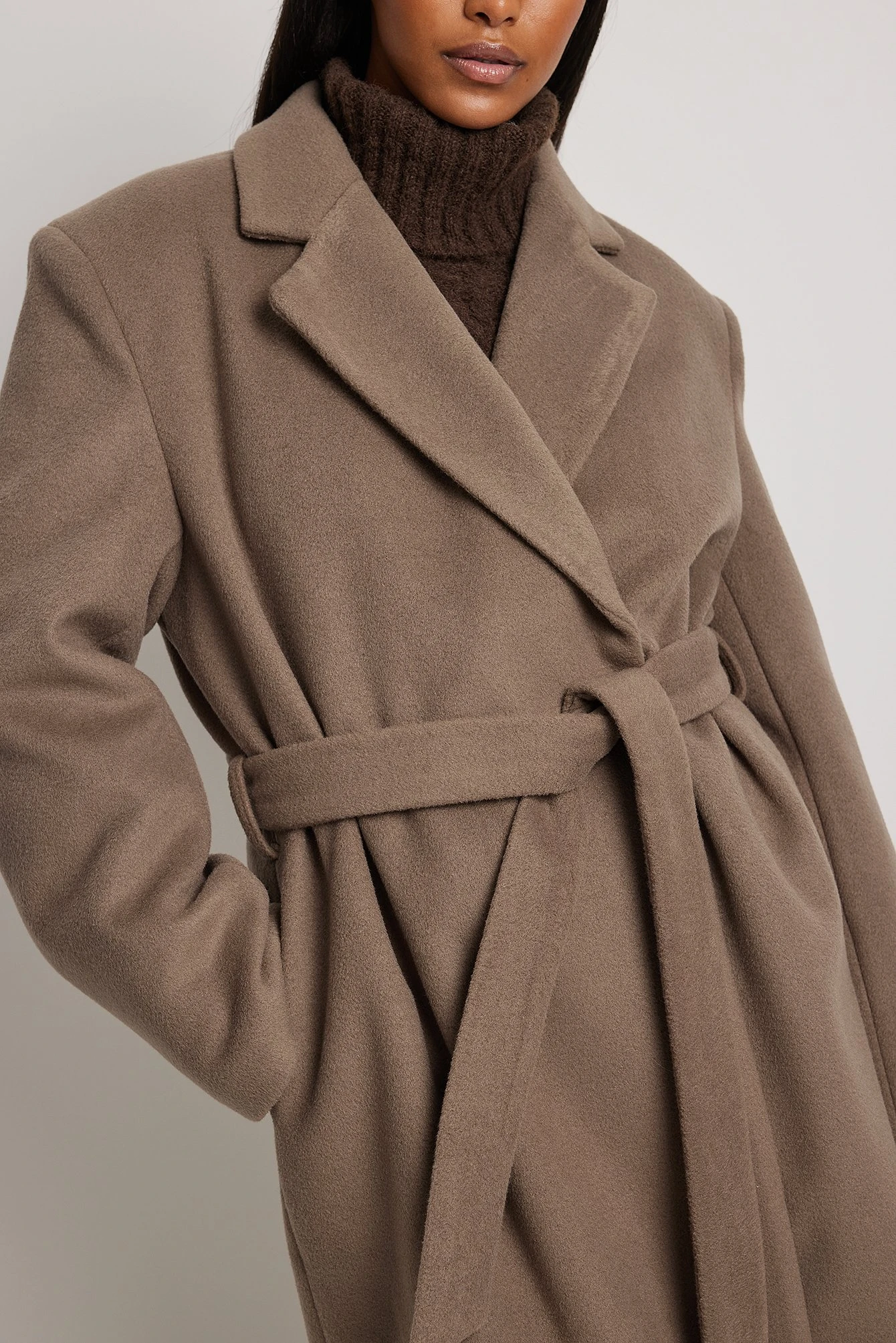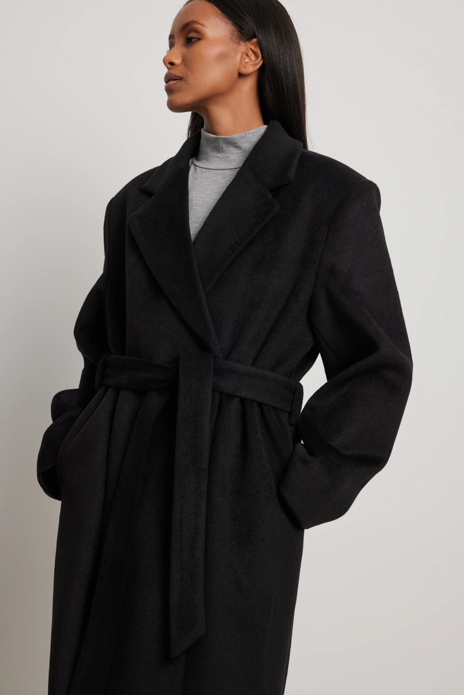 This coat is belted and features a lapel detail, a padded shoulder, an overlap design with a hidden snap button closure, side pockets and a back slit detail.