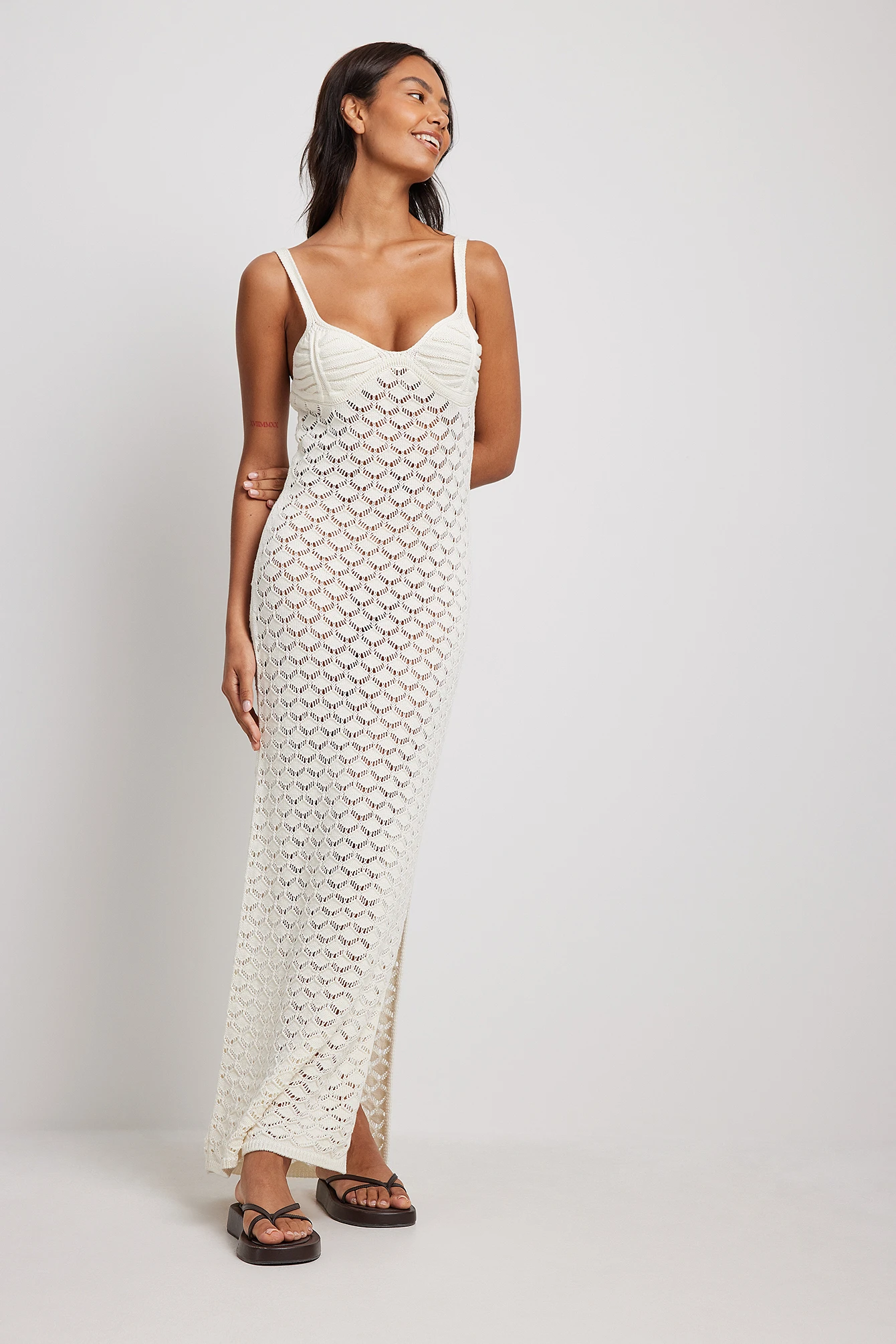 This dress features a v neckline with detailed cups, shoulder straps, a maxi length with a side slit and a knitted, seethrough material.