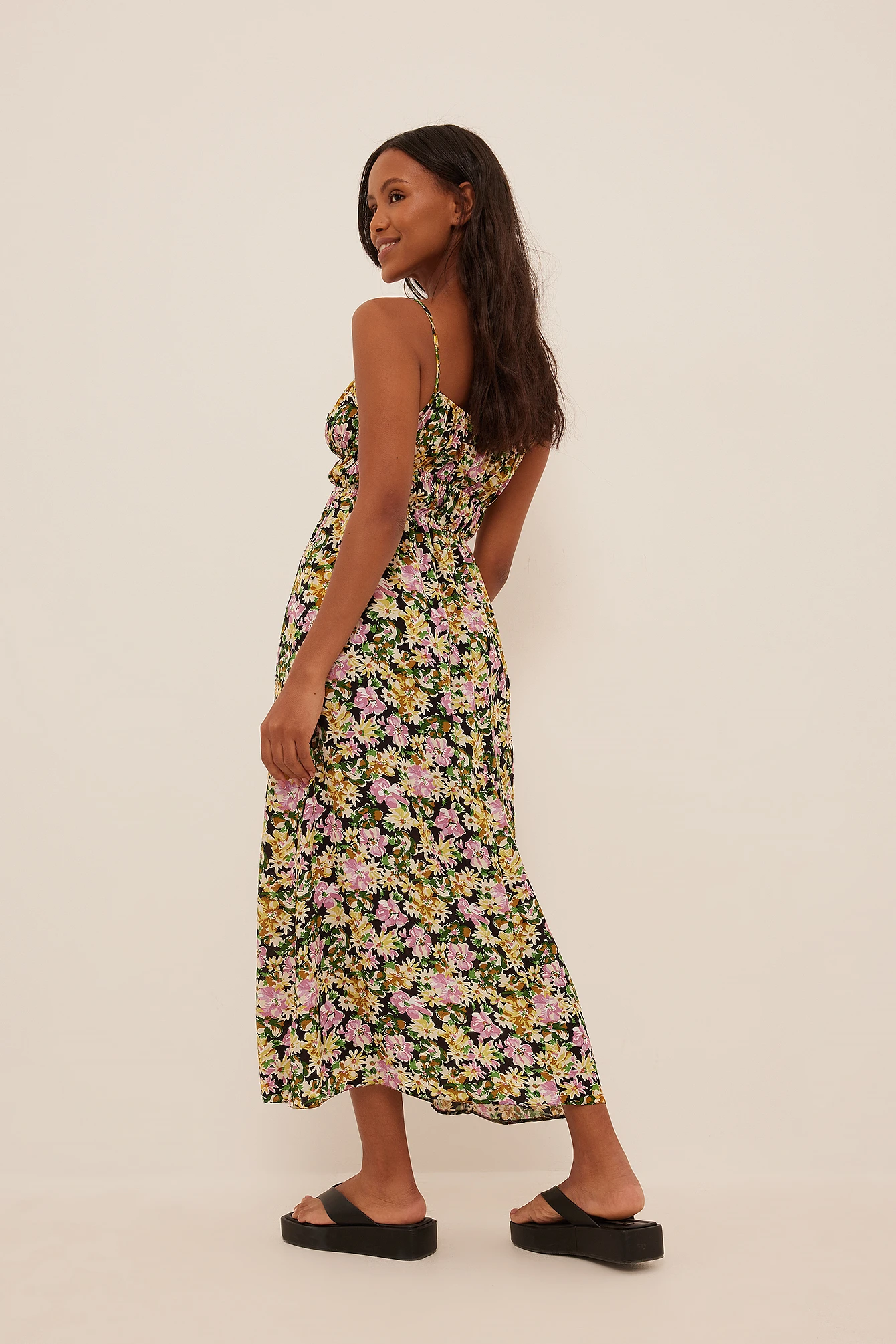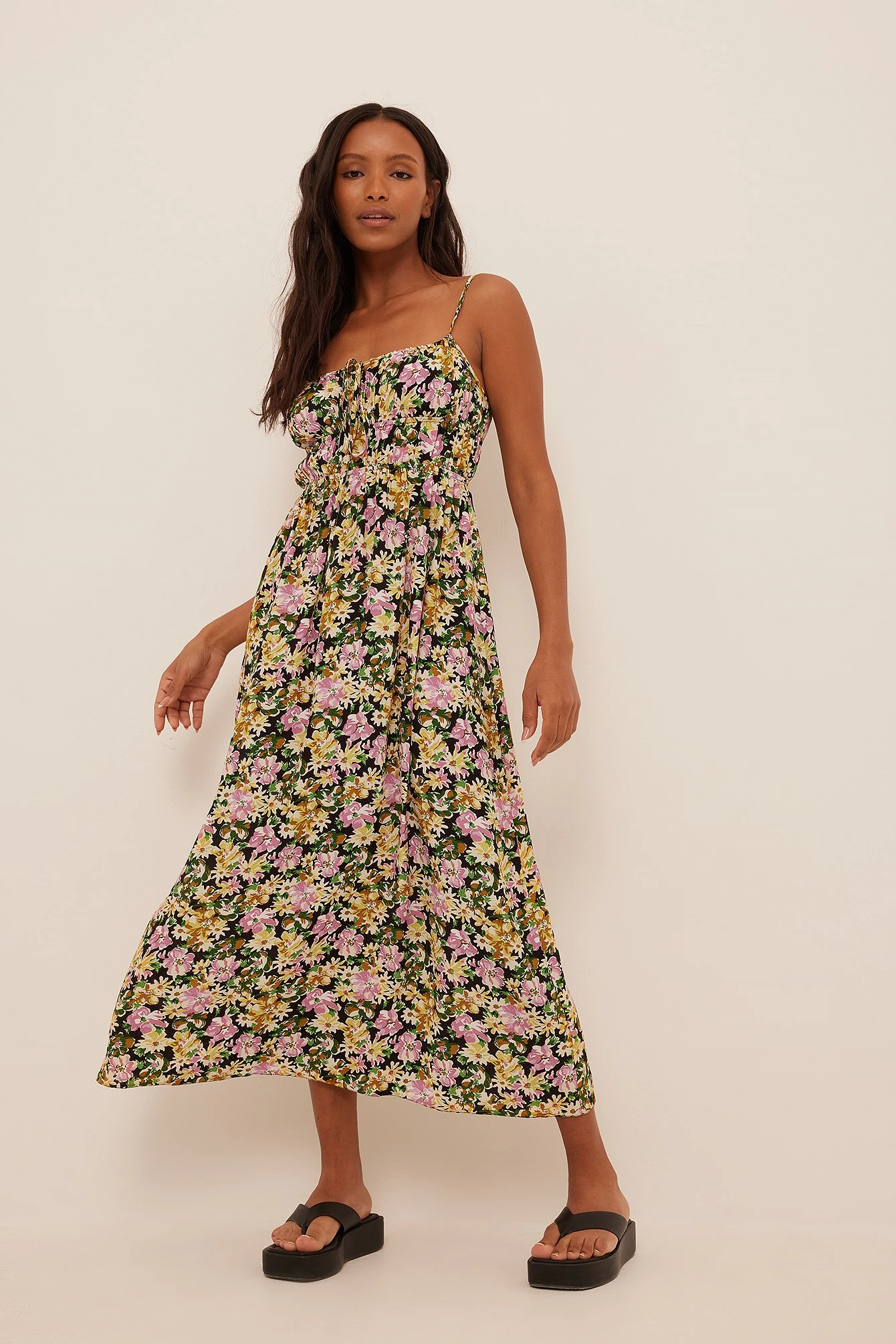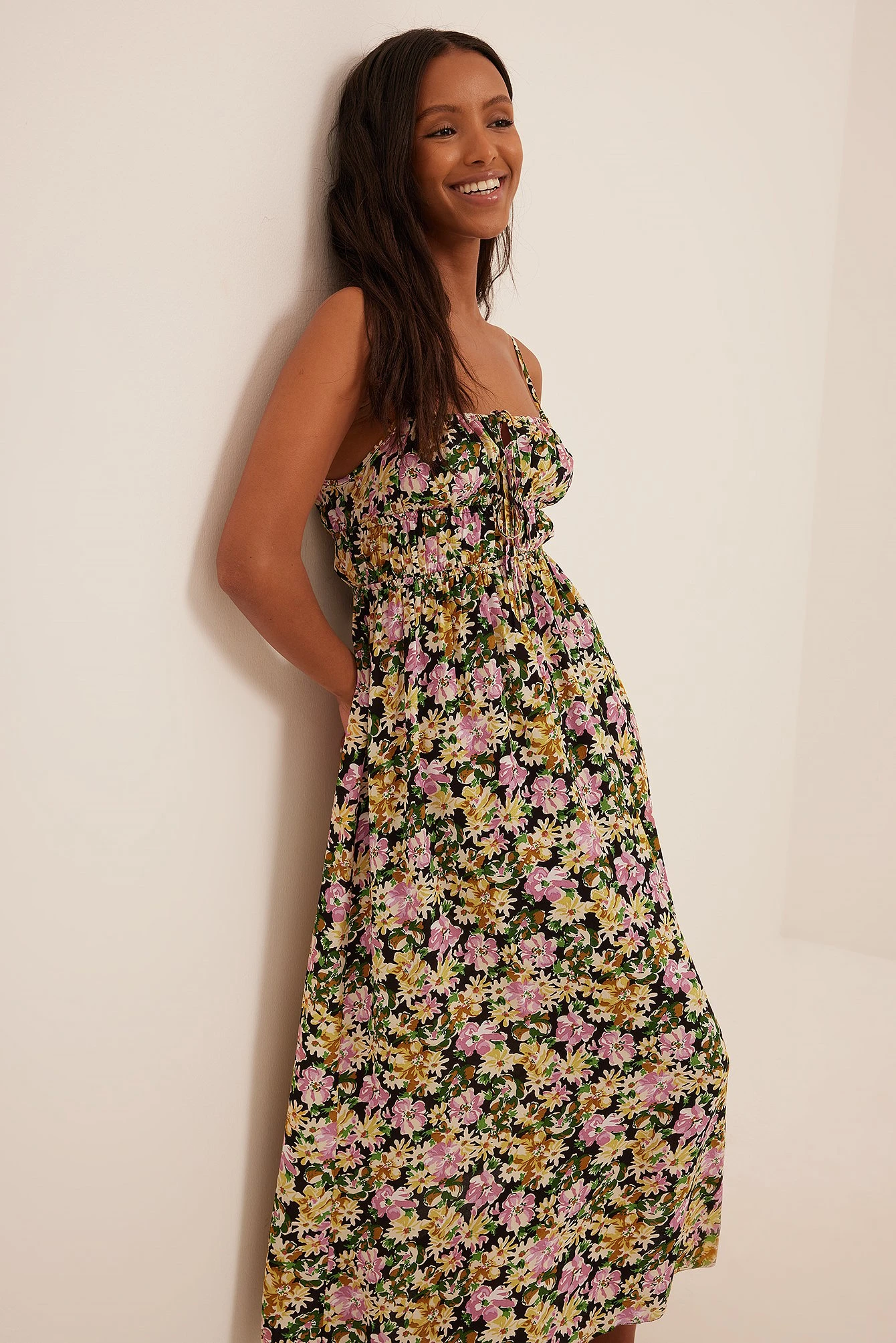 This midi dress is smocked and features shoulder straps and a self-tie on the chest.