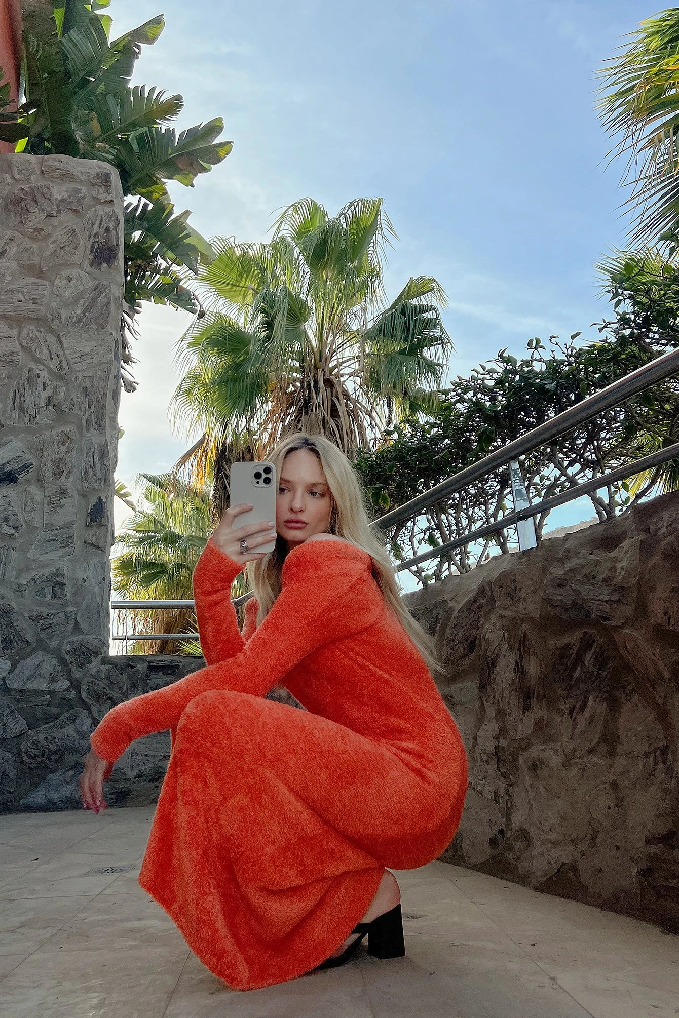 This maxi dress is fluffy and features long sleeves, a scoop neck and a soft touch.