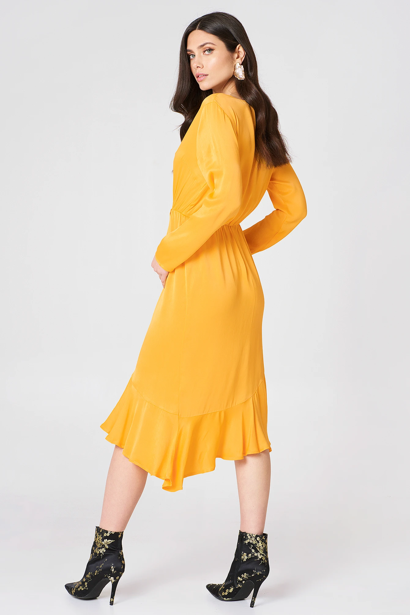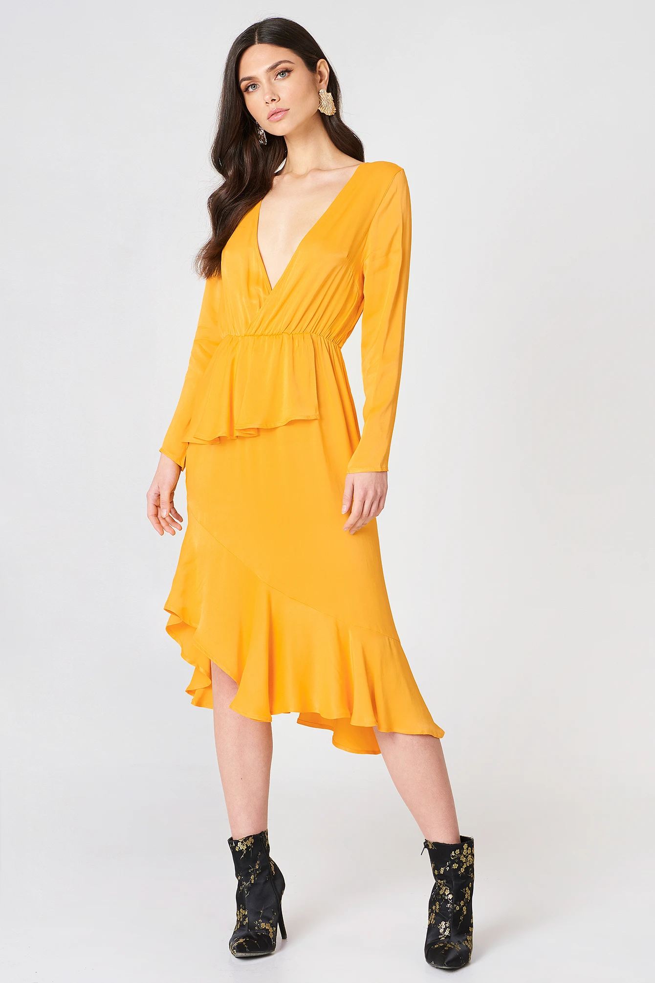 The Frill Detail Long Sleeve Dress by NA-KD features a low wrapped neckline, a frill detail at the waist, and a flowy asymmetrical bottom hem.