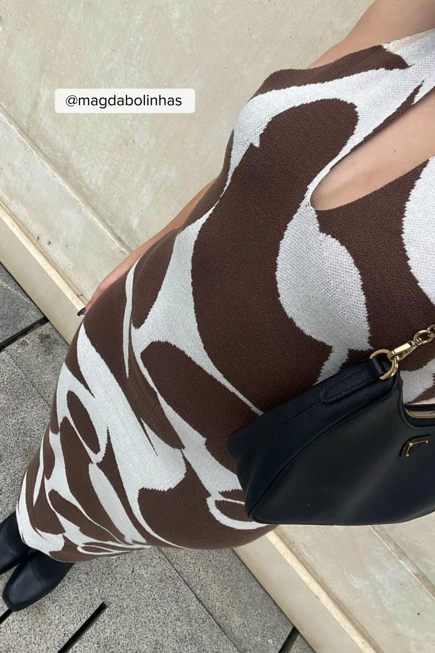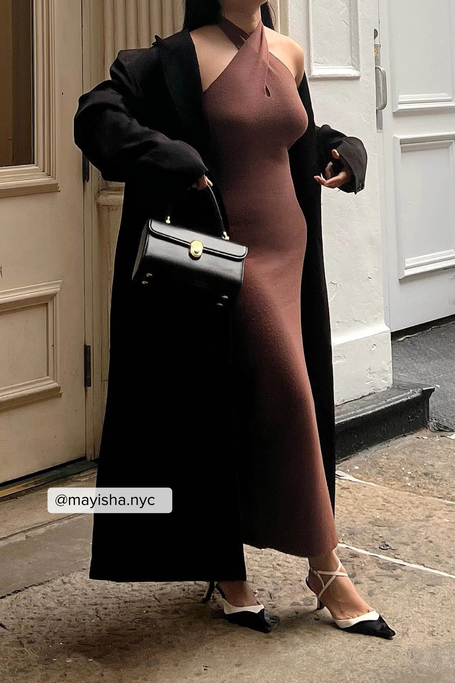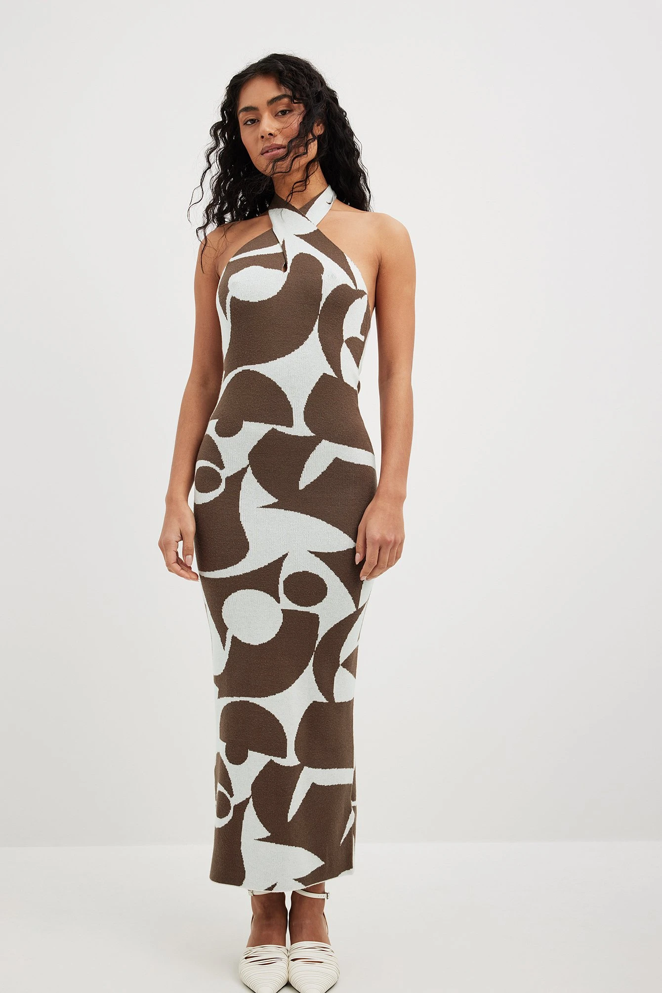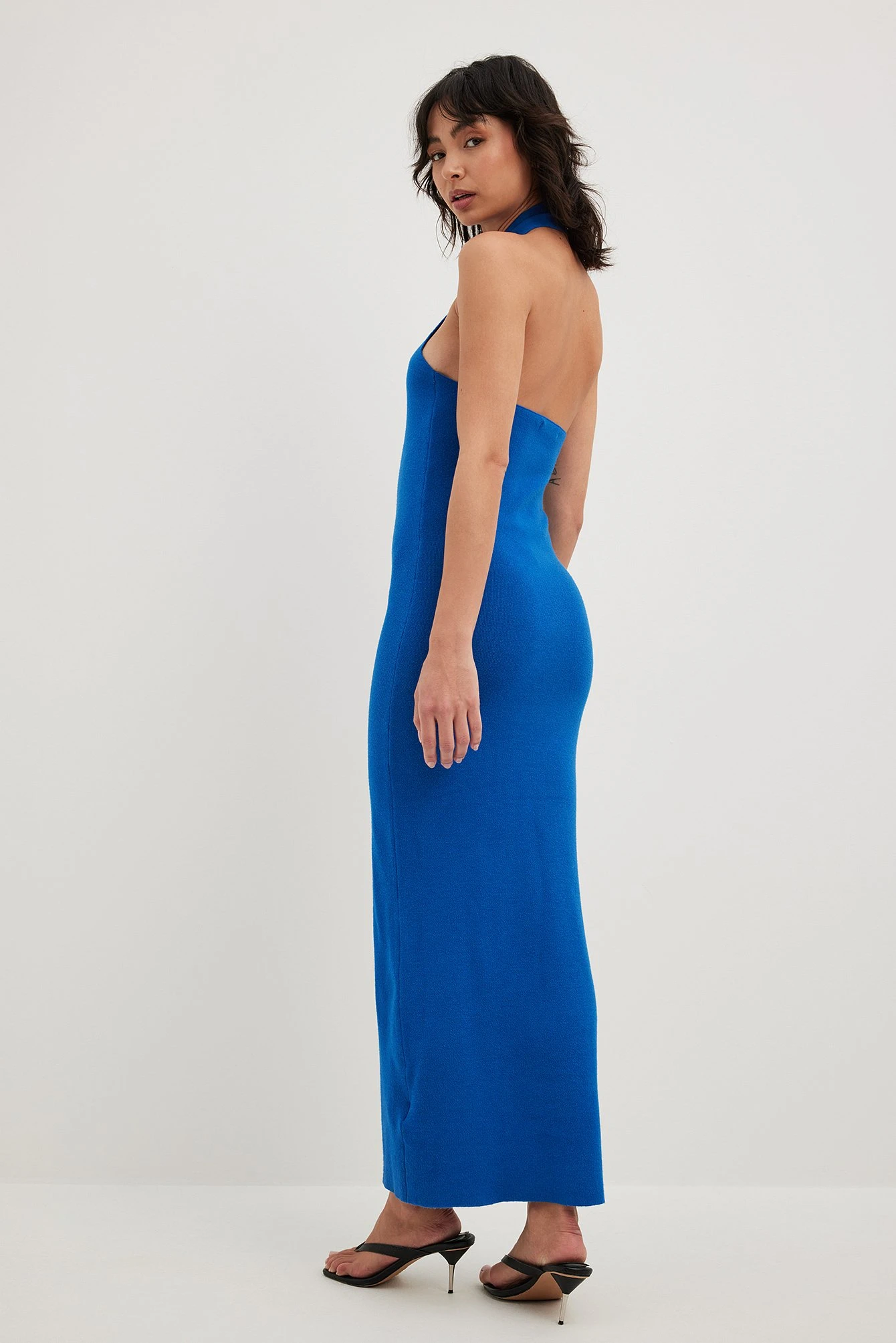 This midi dress features a halterneck strap. It has a soft stretchy material.