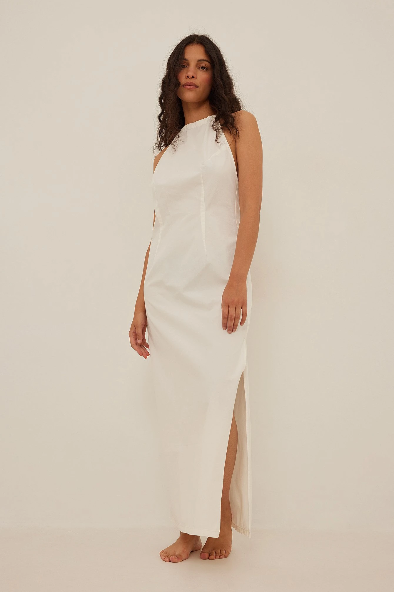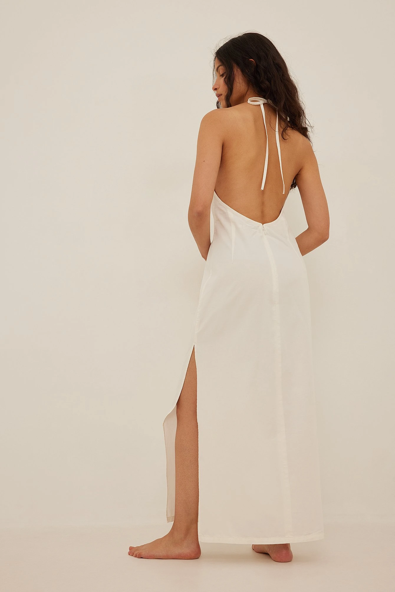 This maxi dress features a halterneck tie, a square neckline, a back zipper and a side slit.