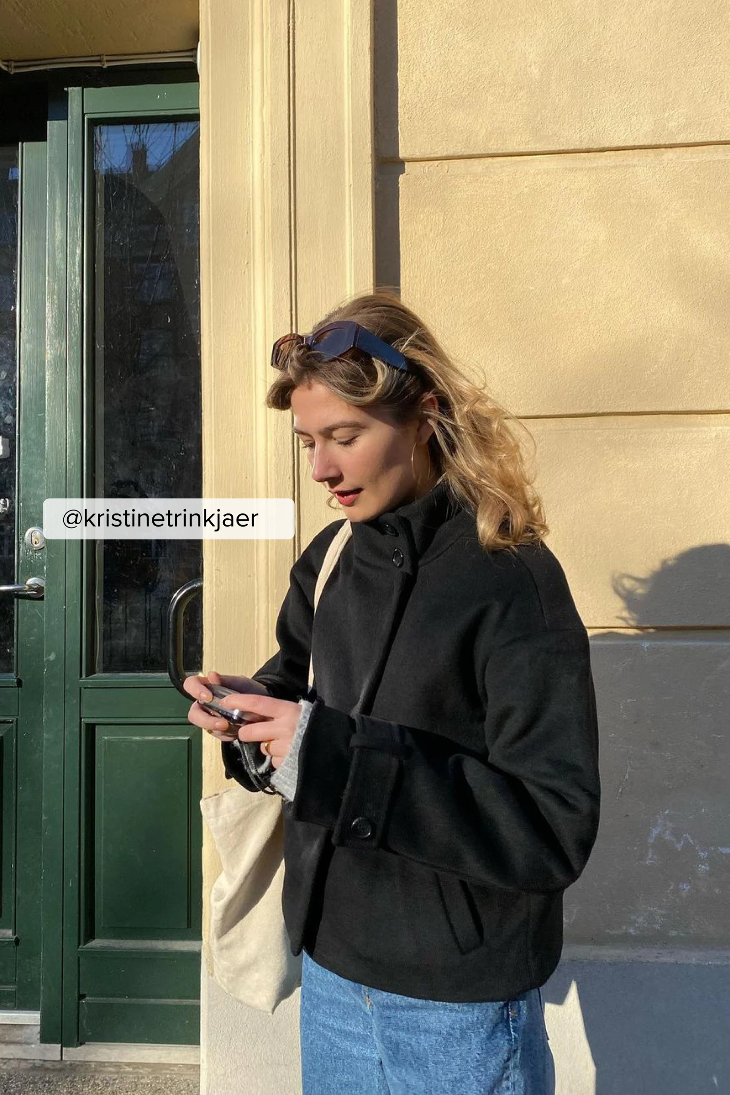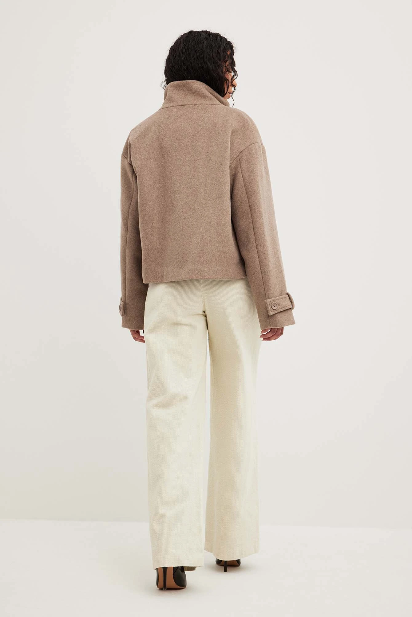 This coat is fully lined and features a short fit. It has a high neck with two button closures and hidden snap button closures along the front. This coat features long sleeves with a belted detail and slant pockets on the side.