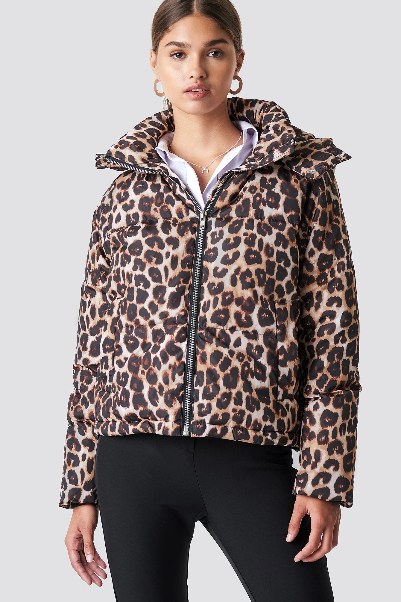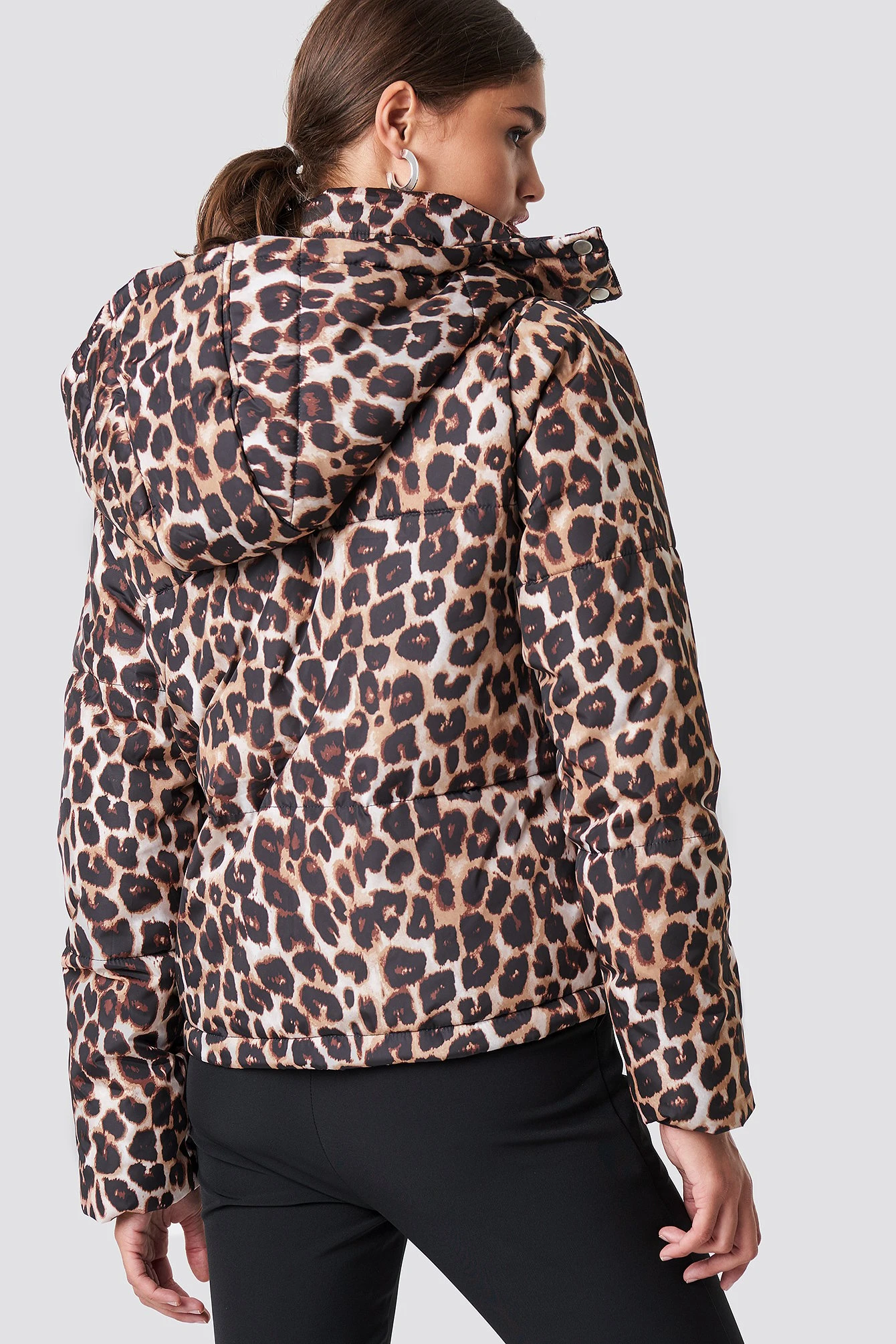 The Leo Printed Padded Jacket by NA-KD Trend features a short length, a warm padded material, a trendy print, long sleeves with stretchy cuffs, a removable hood, a high neck, a zipper closure along the front, and two side pockets.