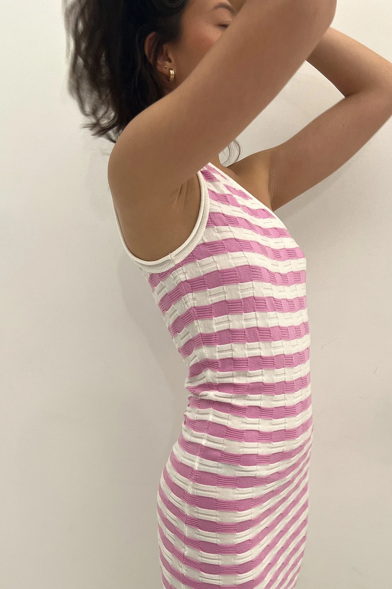 This mini dress is striped and features a one shoulder design, a fine knit and a stretchy material.