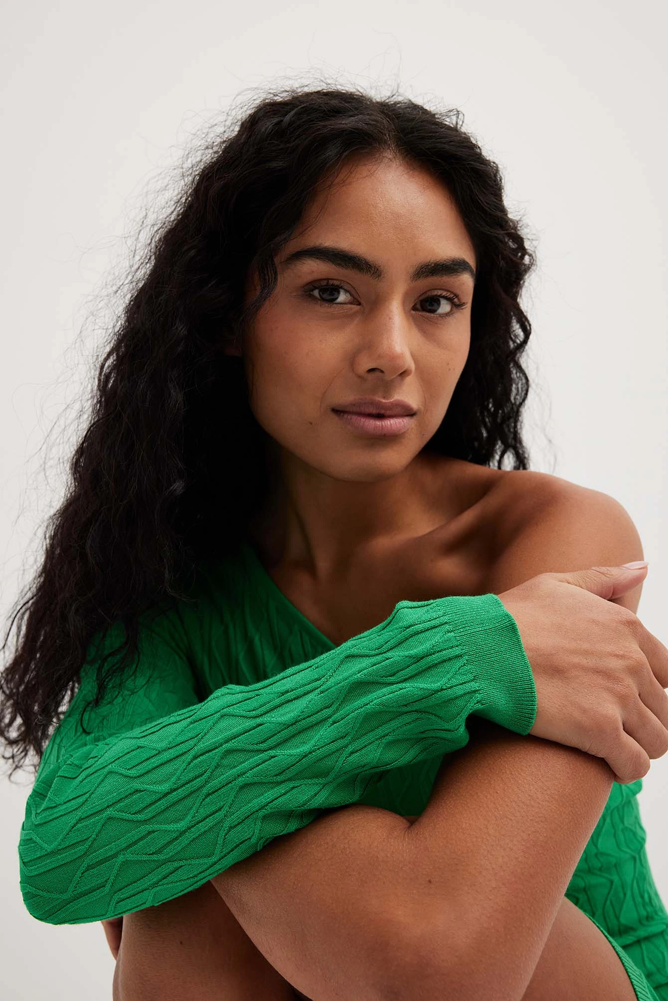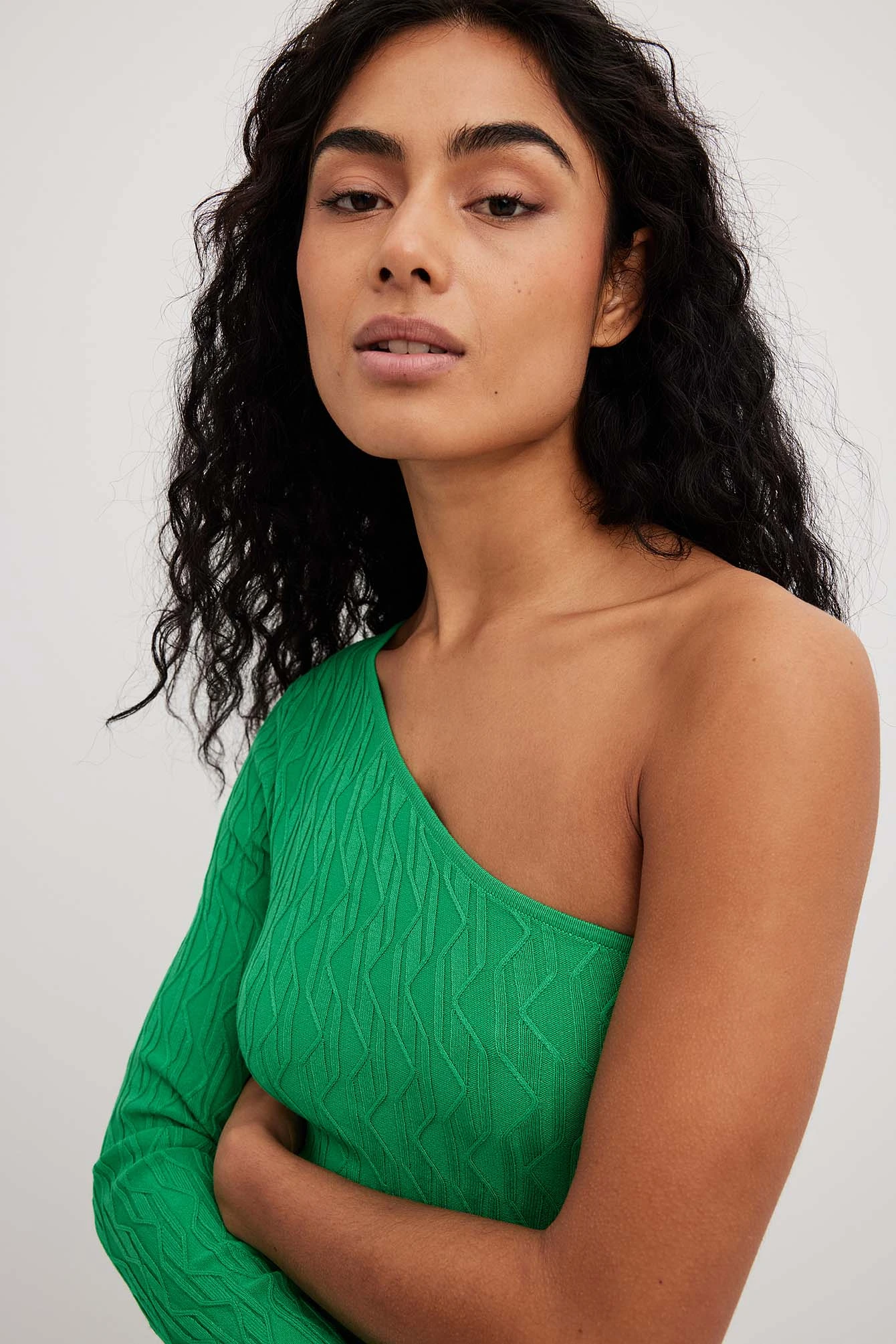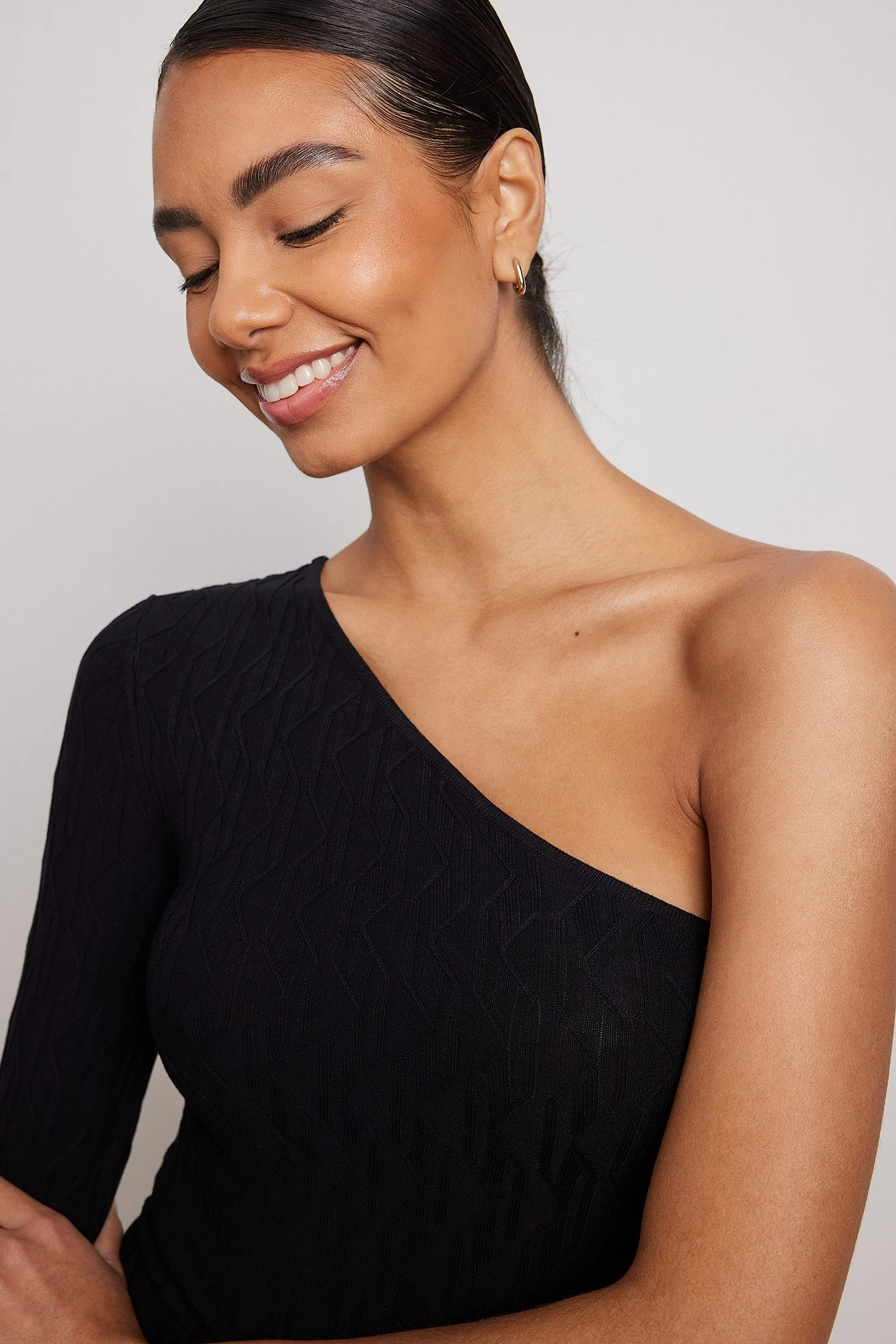 This mini dress features a one shoulder design with a long sleeve, ribbed hems and a stretchy, knitted, patterned material.