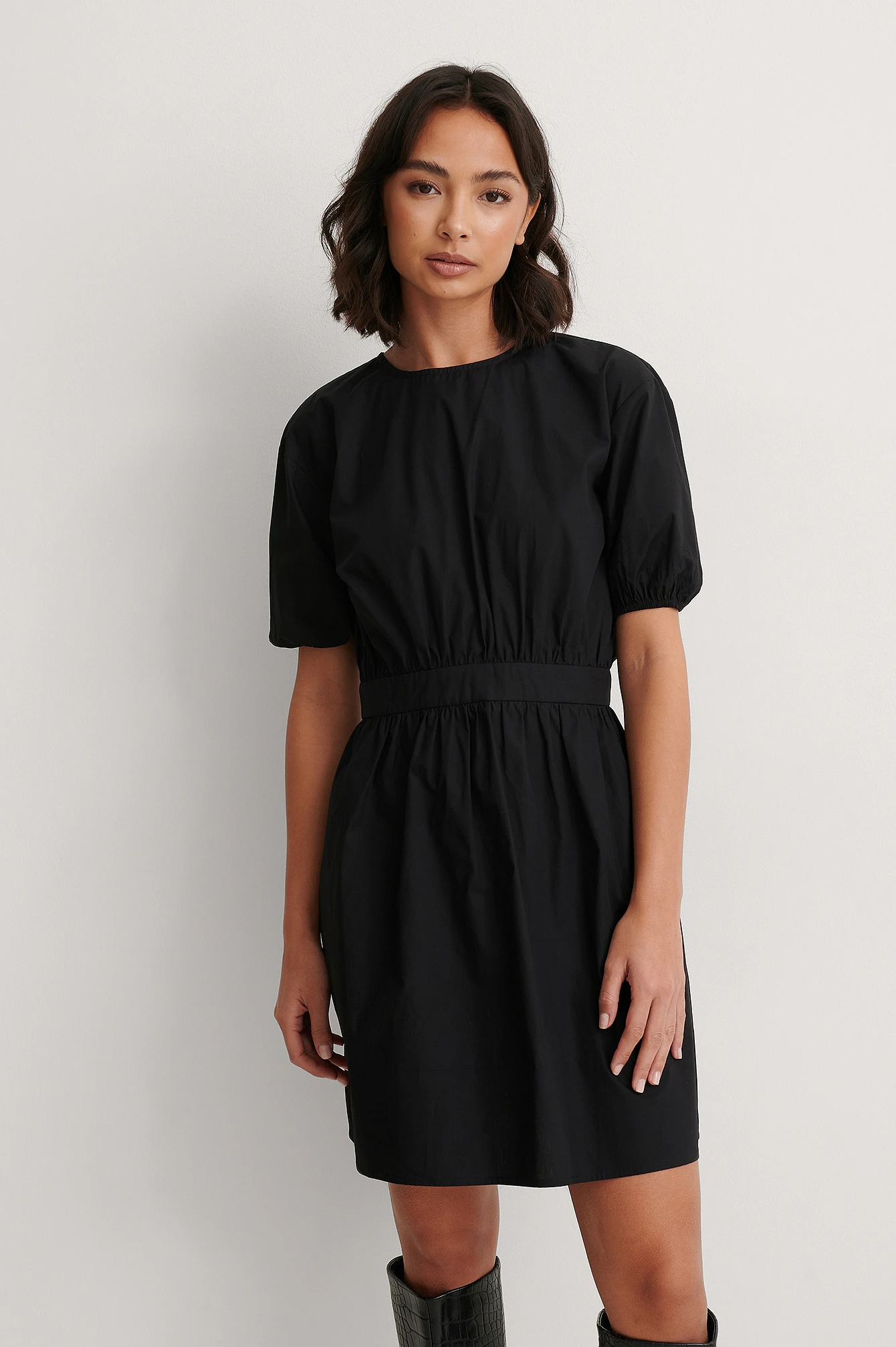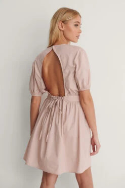 This mini dress features a round neck. It has drop shoulders and short sleeves. This mini dress features an open back with a drawstring detail, a marked waist with gathered seams and a flowy fit.