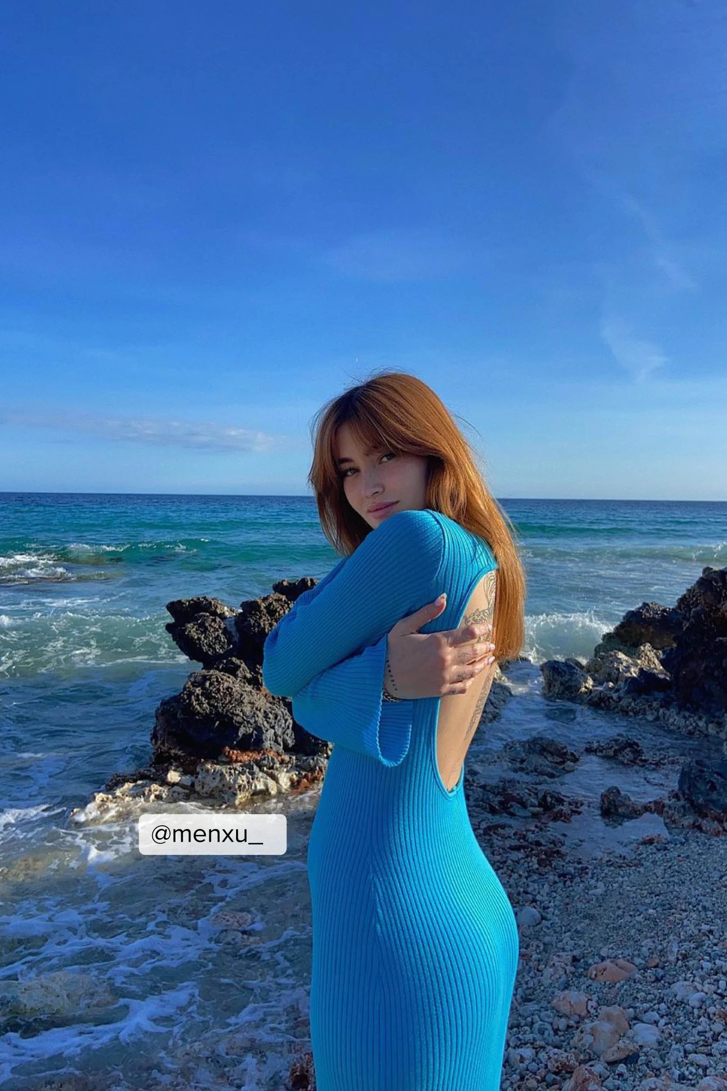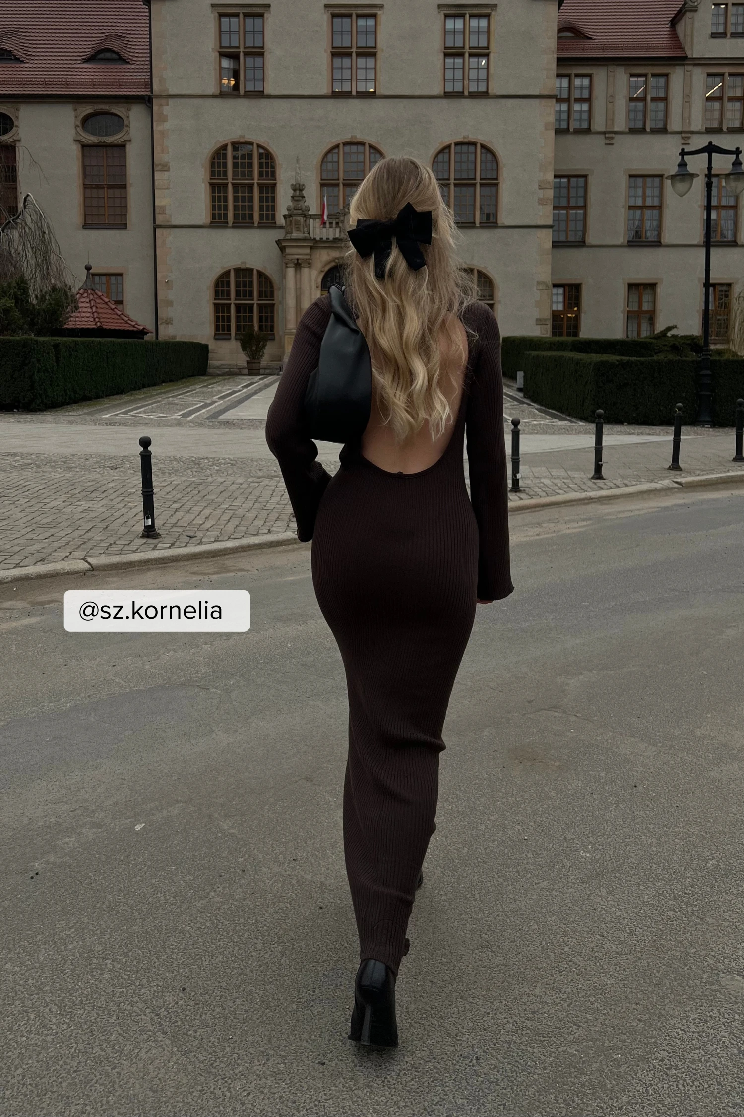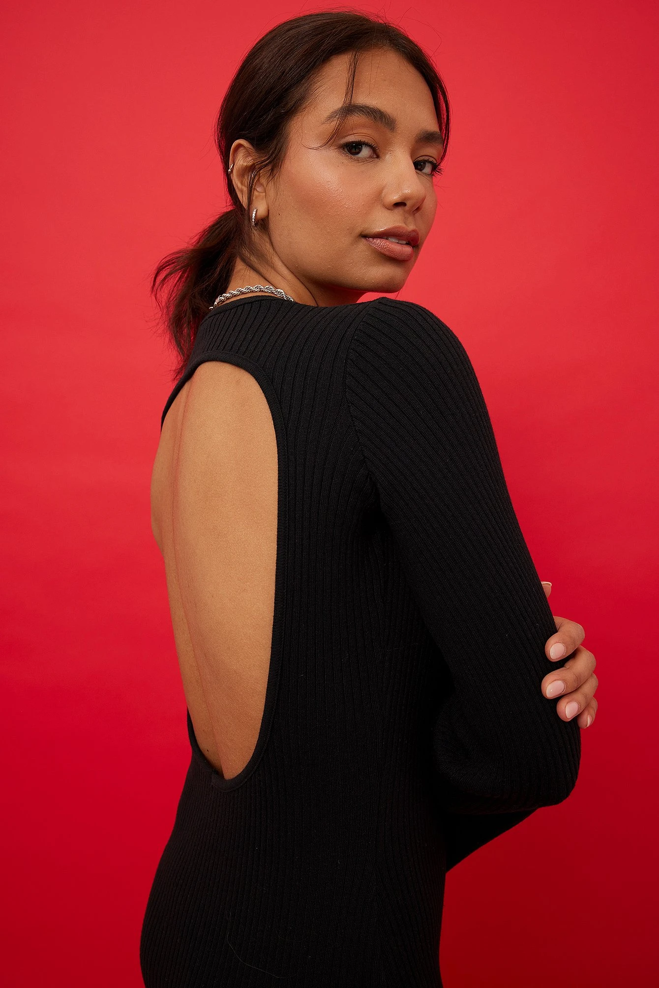 This dress features a round neckline. It has long sleeves with wide cuffs and an open back design. This dress features a maxi length and a stretchy, knitted material.