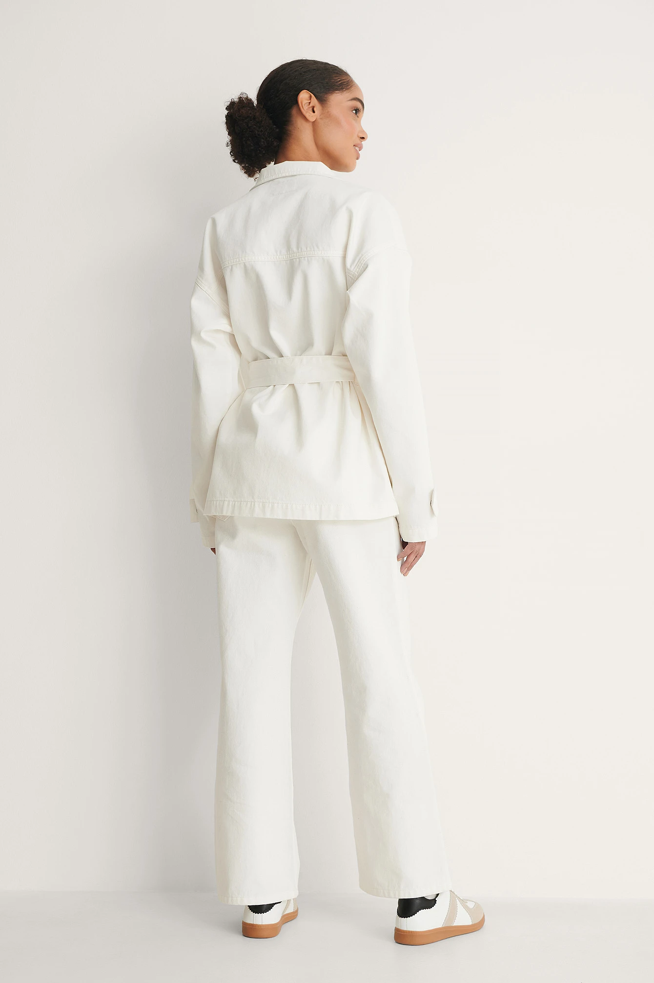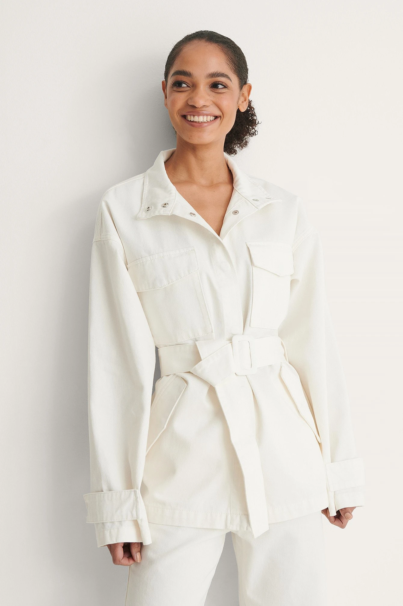 This jacket features a collar with a straight design. It has hidden snap button closures along the front and two snap button flap pockets on the chest. This jacket features two pockets on each side with a snap button closure, straight long sleeves with two snap button closures at the end, a removable waist belt and an oversized fit.